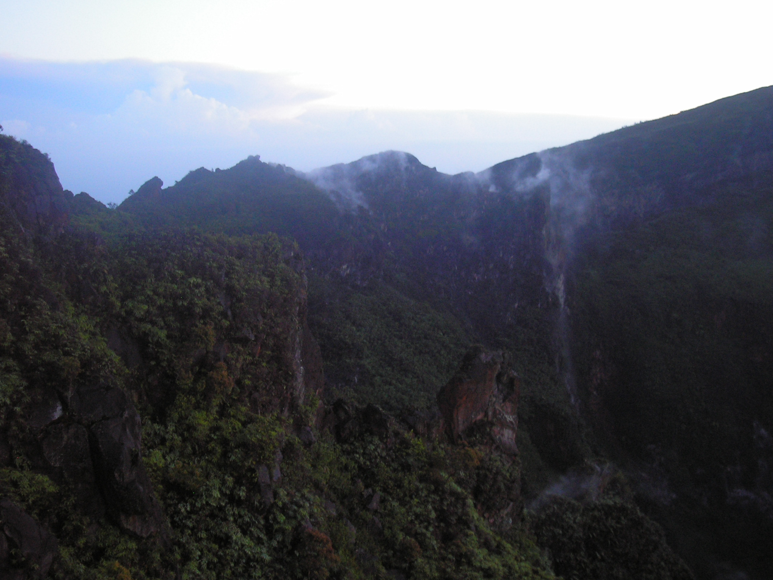 Although most hikers are happy enough to enjoy the incredible atmosphere of the mountain and the views, the summit itself lies a considerable way beyond the crater. The regularly visited section of the rim is at an elevation of approximately 1,620m although the highest point of the rim (on the northern side) is 1,646m according to Bakosurtanal maps. Unfortunately, the terrain is incredibly steep, hazardous (immense drops and sulphur gas) and there is no route through the vegetation which covers the sharp rocks. Reaching the very top of the rim is a considerable task which people rarely undertake. It could probably be reached in about one hour (assuming you have the confidence required). Following the rim clockwise is the easier option but neither are easy.
