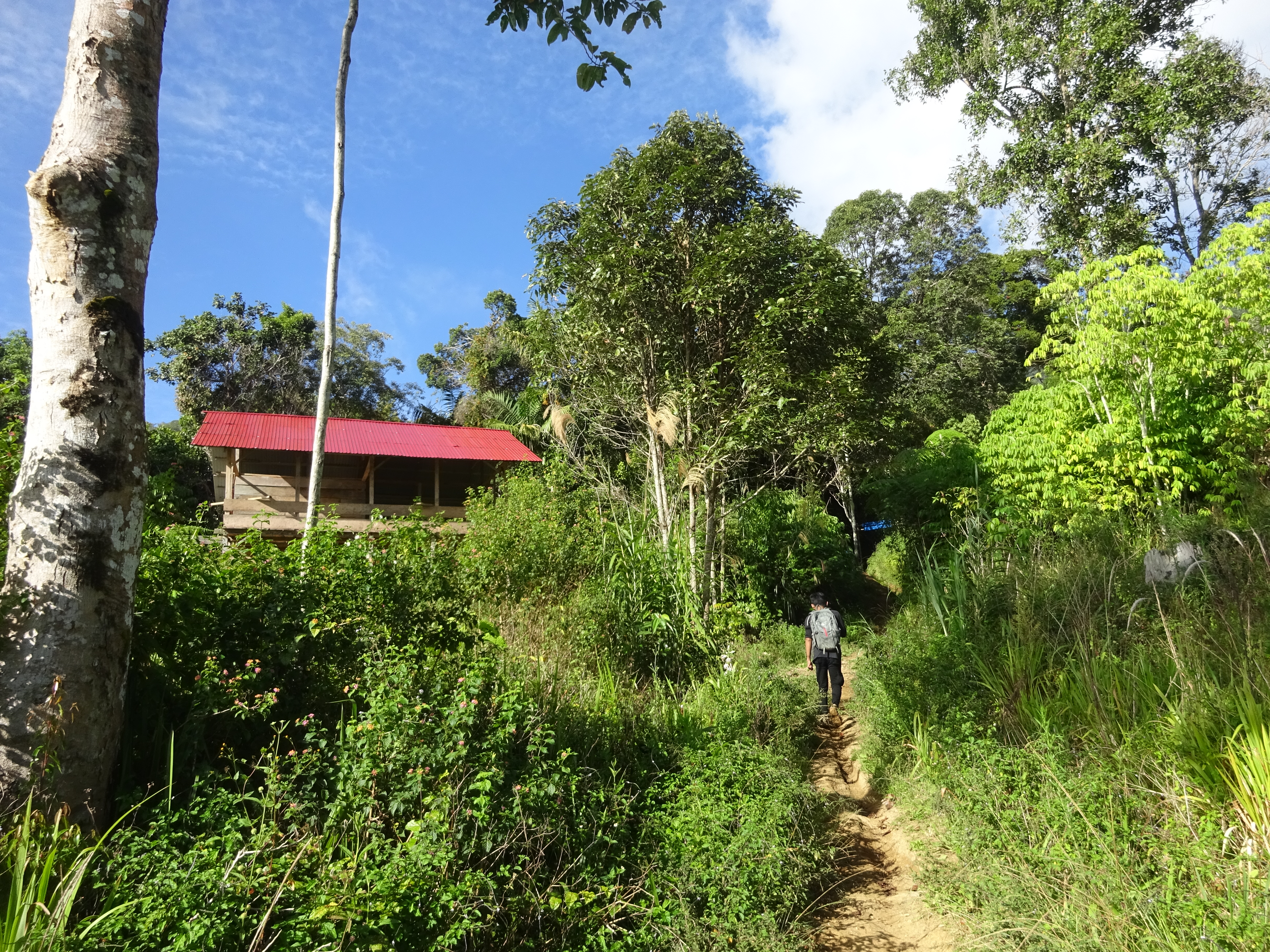 Bongkudai Baru/Utara is at about 1,085 metres above sea level and on the shores of the picturesque Danau (lake) Mooat. The views over the lake at first light are exceedingly pleasant. Originally, the trail led up a wide farm track between fields in which farm workers will probably be working even at 6am but in 2021 this has already been paved so you can leave your motorbike up at 1,162m where the road ends. Before long the trail narrows and enters forest just after a large wooden shelter on the left and an entrance sign (1,254m). Not so long after this point there are several important and unsignposted turnings you need to make so a local guide is a very good idea.