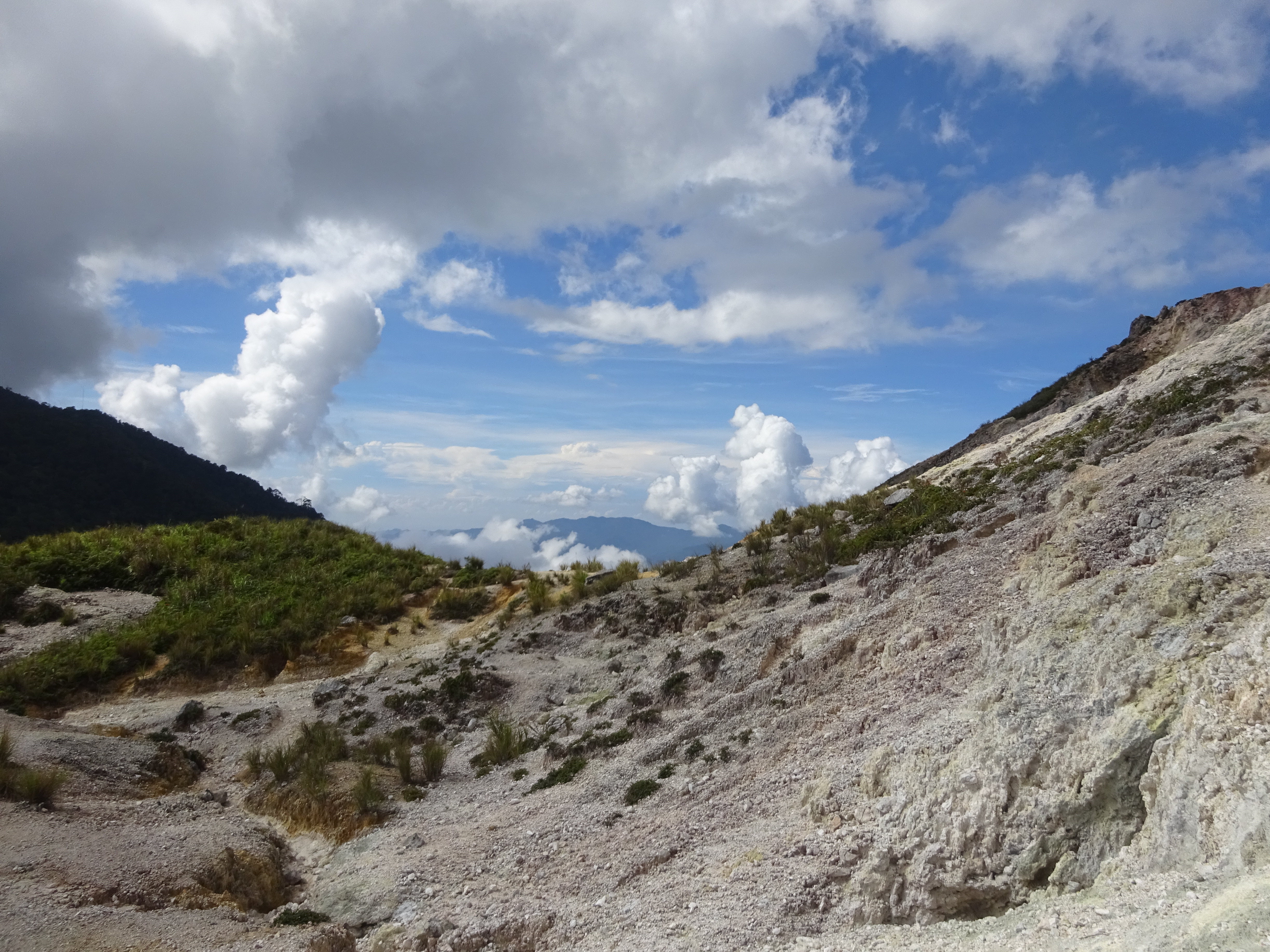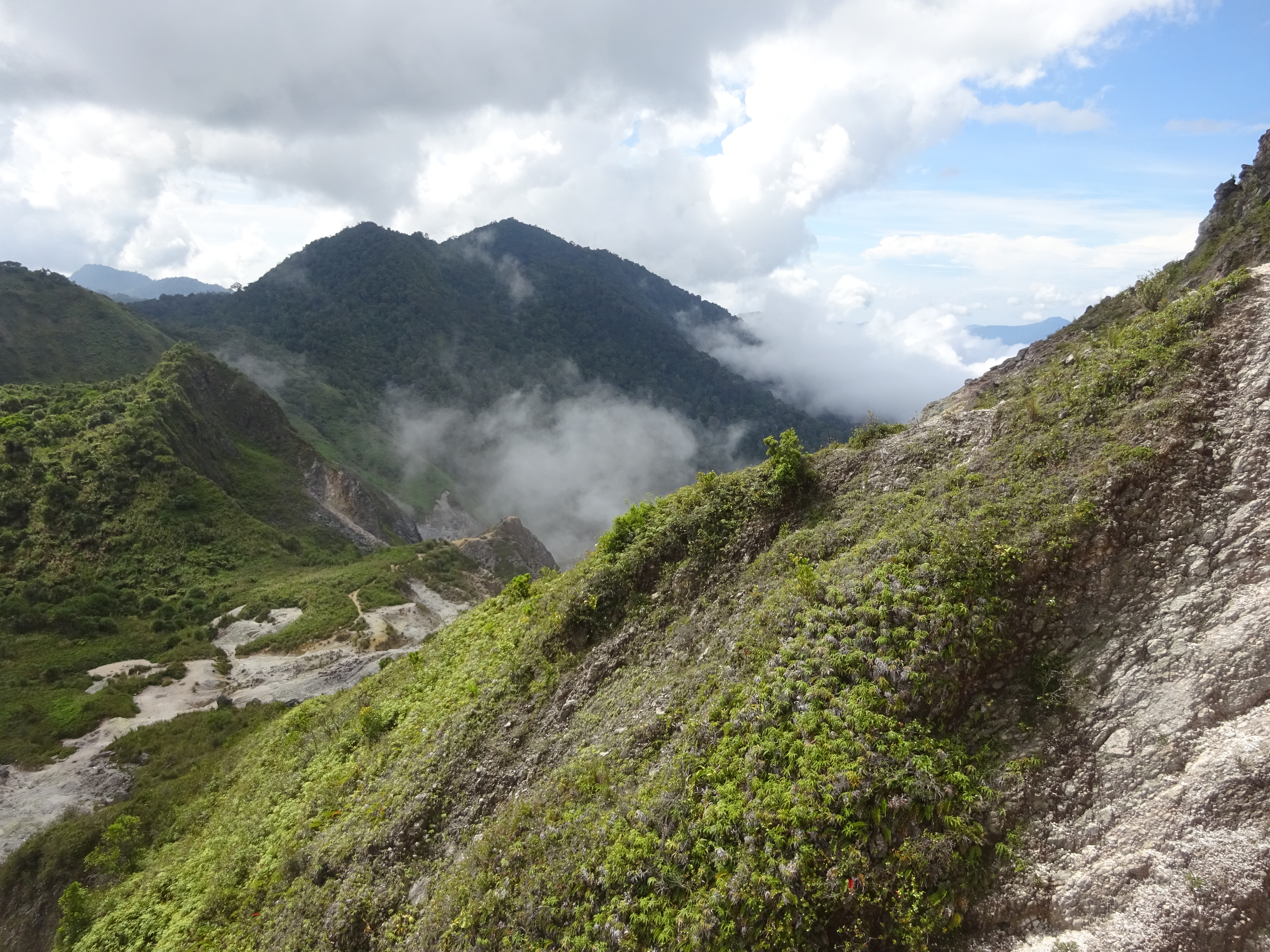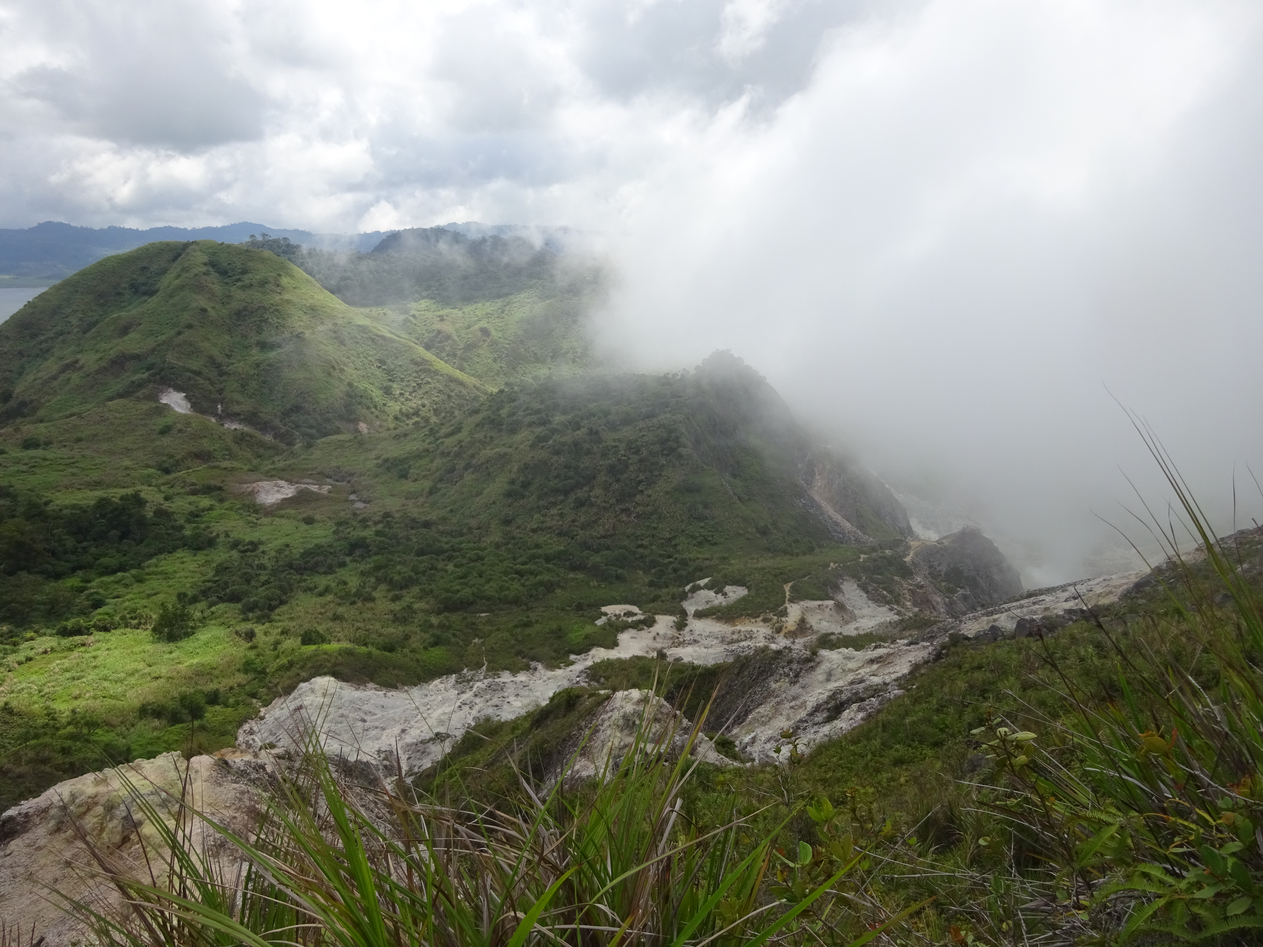 After a junction (left for a camping area and a stream of natural hot water which is reportedly safe to drink) you find yourself on white rocks at the start of the crater itself (1,447m). The view back down to Danau Mooat and a jungle-clad peak behind it is wonderful but the better views are actually to be found further over on a little rocky top on the far side of the crater area. A few fumaroles seem to be permanently active. Up to the right are steep crater cliff walls.