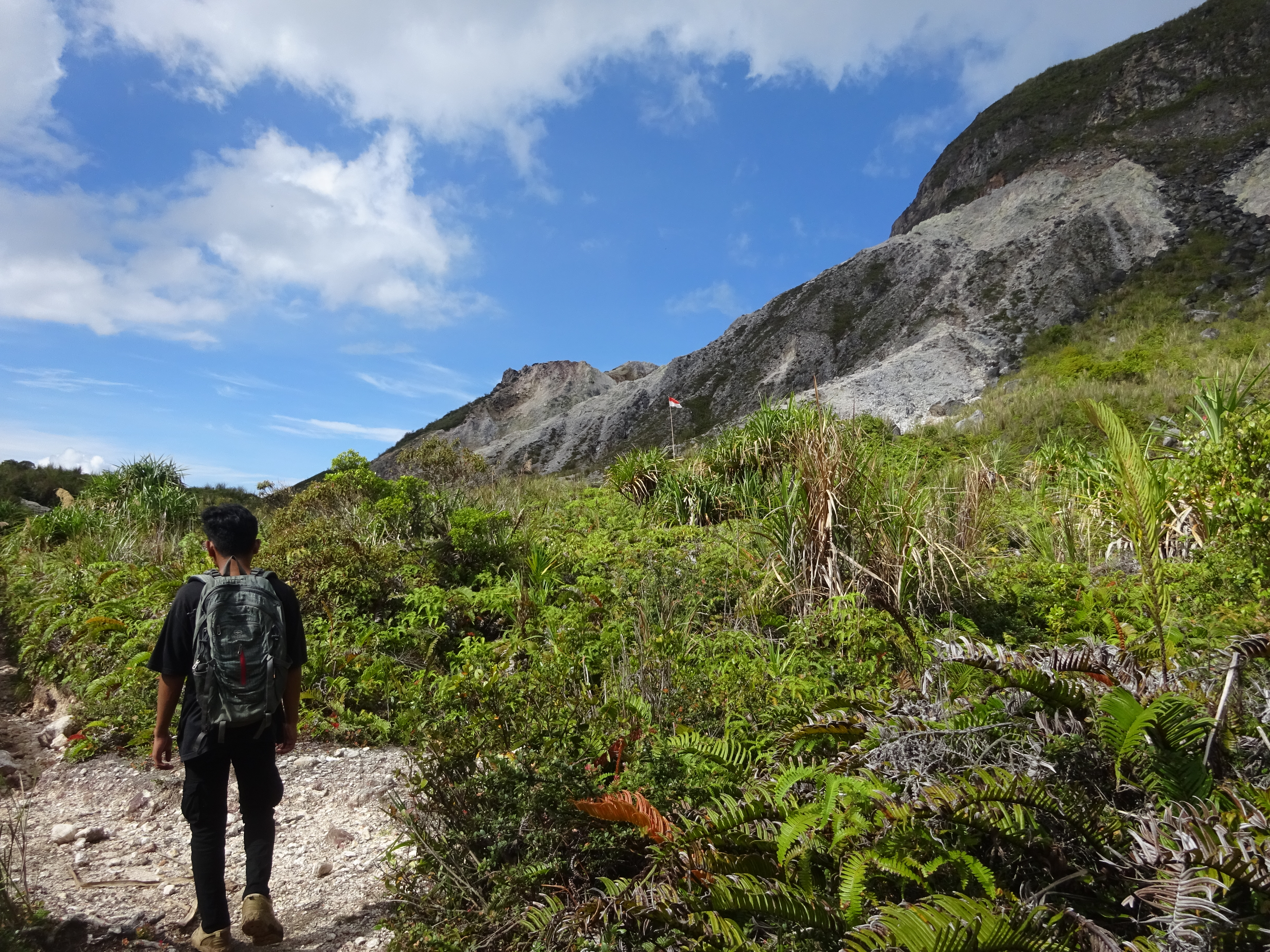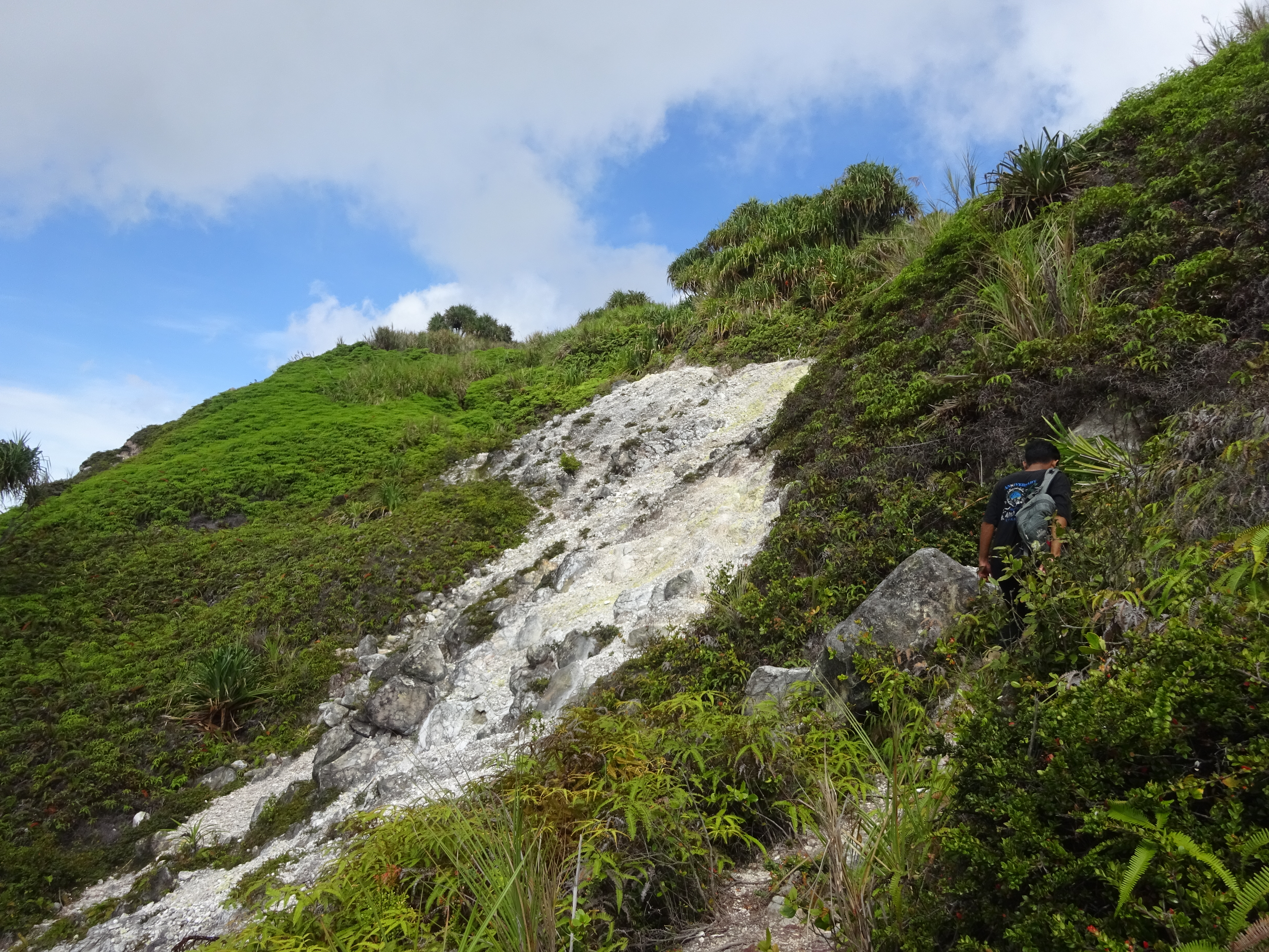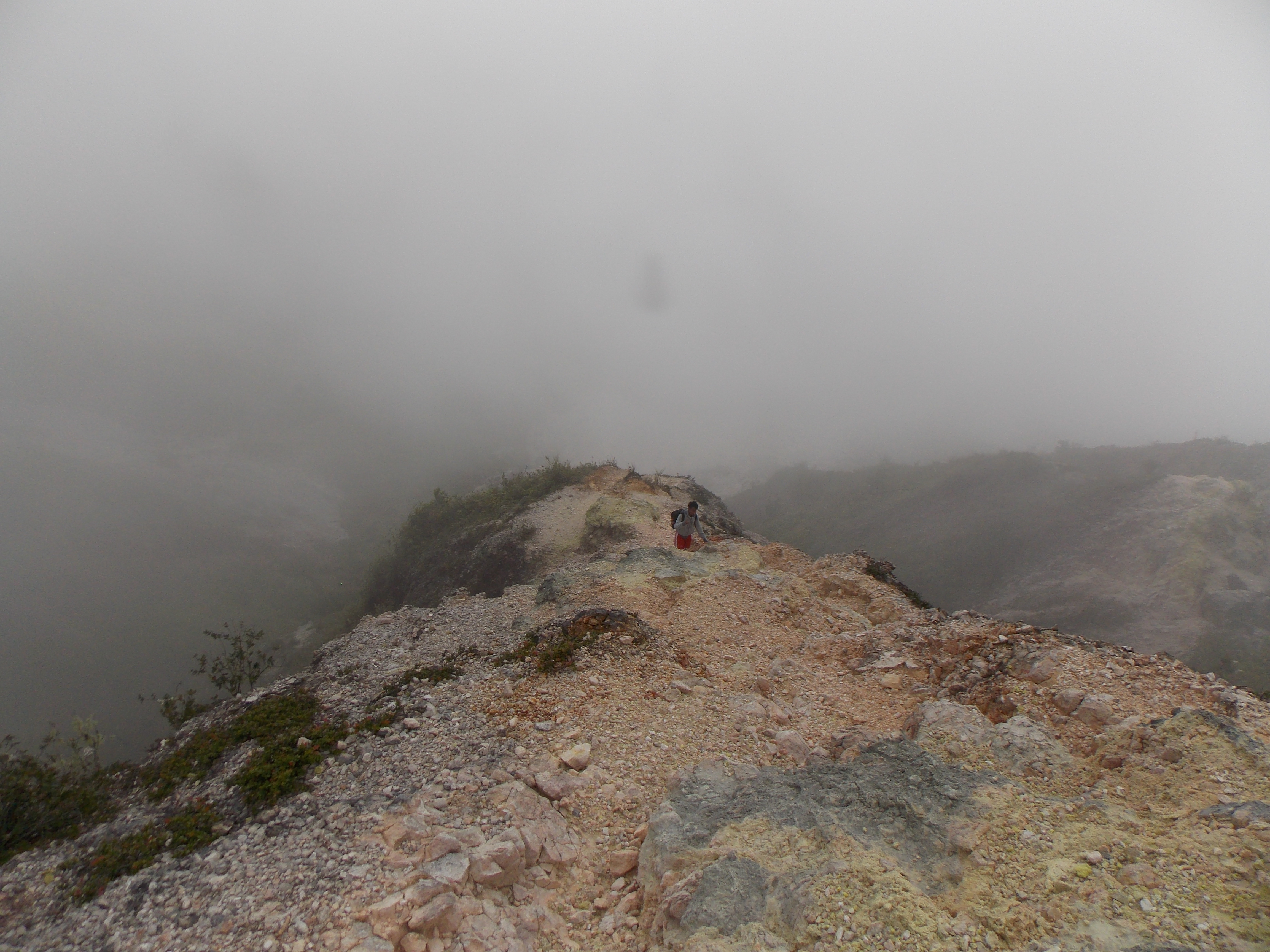 After a junction (left for a camping area and a stream of natural hot water which is reportedly safe to drink) you find yourself on white rocks at the start of the crater itself (1,447m). The view back down to Danau Mooat and a jungle-clad peak behind it is wonderful but the better views are actually to be found further over on a little rocky top on the far side of the crater area. A few fumaroles seem to be permanently active. Up to the right are steep crater cliff walls.