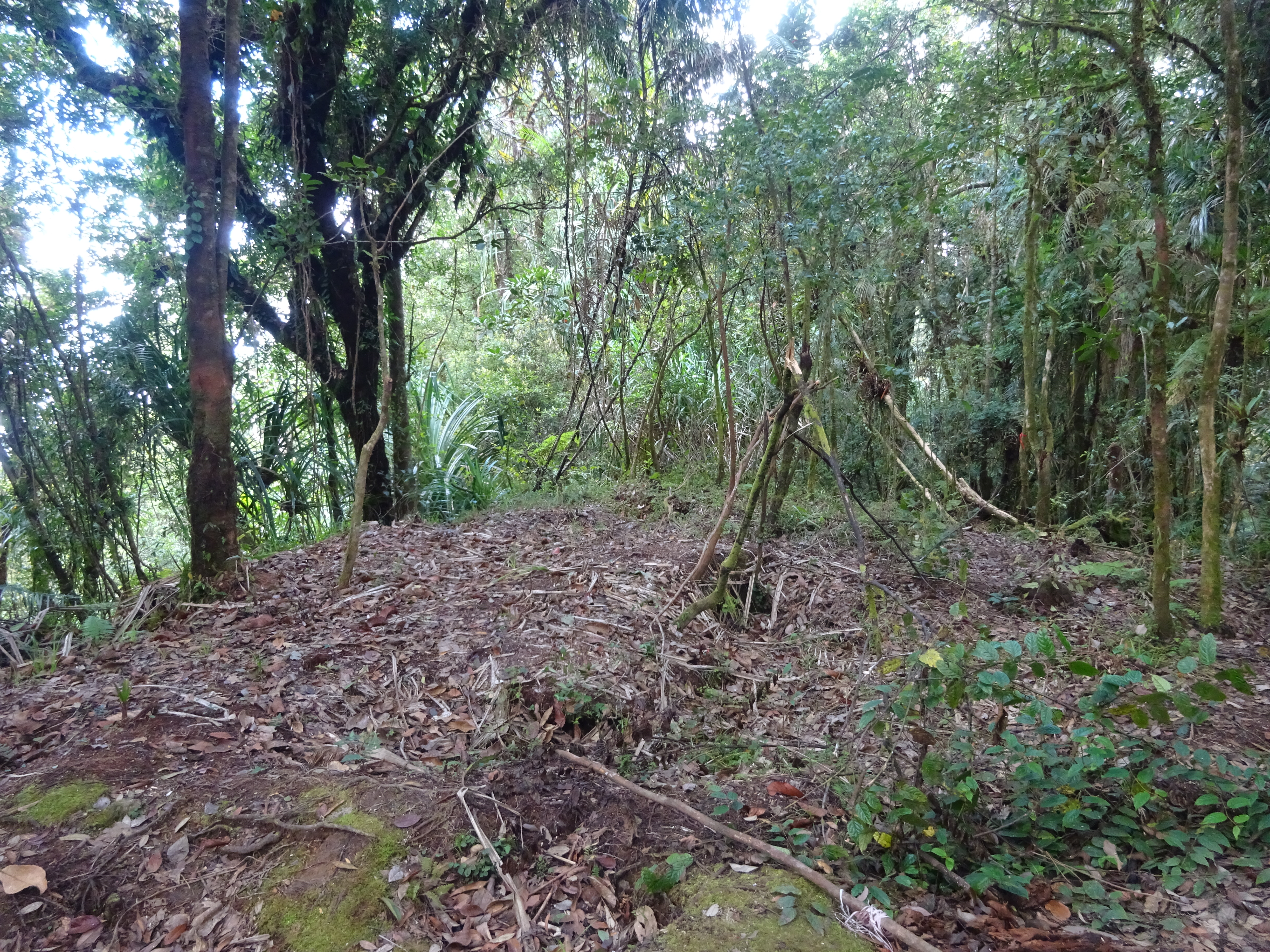 At the top of the cliffs is a flat area and small camp spot (1,666m). Down below is yet another crater area with active fumaroles. To reach the summit, you now need to leave the impressive views behind and head into the undergrowth which eventually leads into proper forest and drops down slightly to where there is a small water source (1,650m) which can be either just a couple of pools or a small stream after rainfall. There are a couple of trail junctions here which appear vague. In general, turning right seems to be the best idea to reach the summit. From the water source, the trail leads up more steeply to the summit clearing which is crowned with a double summit pillar. The base is a shapeless lump of cement of unclear antiquity. The new ‘crown’ on top of it is a smaller, more graceful summit marker erected in 2021 by local hiking clubs.