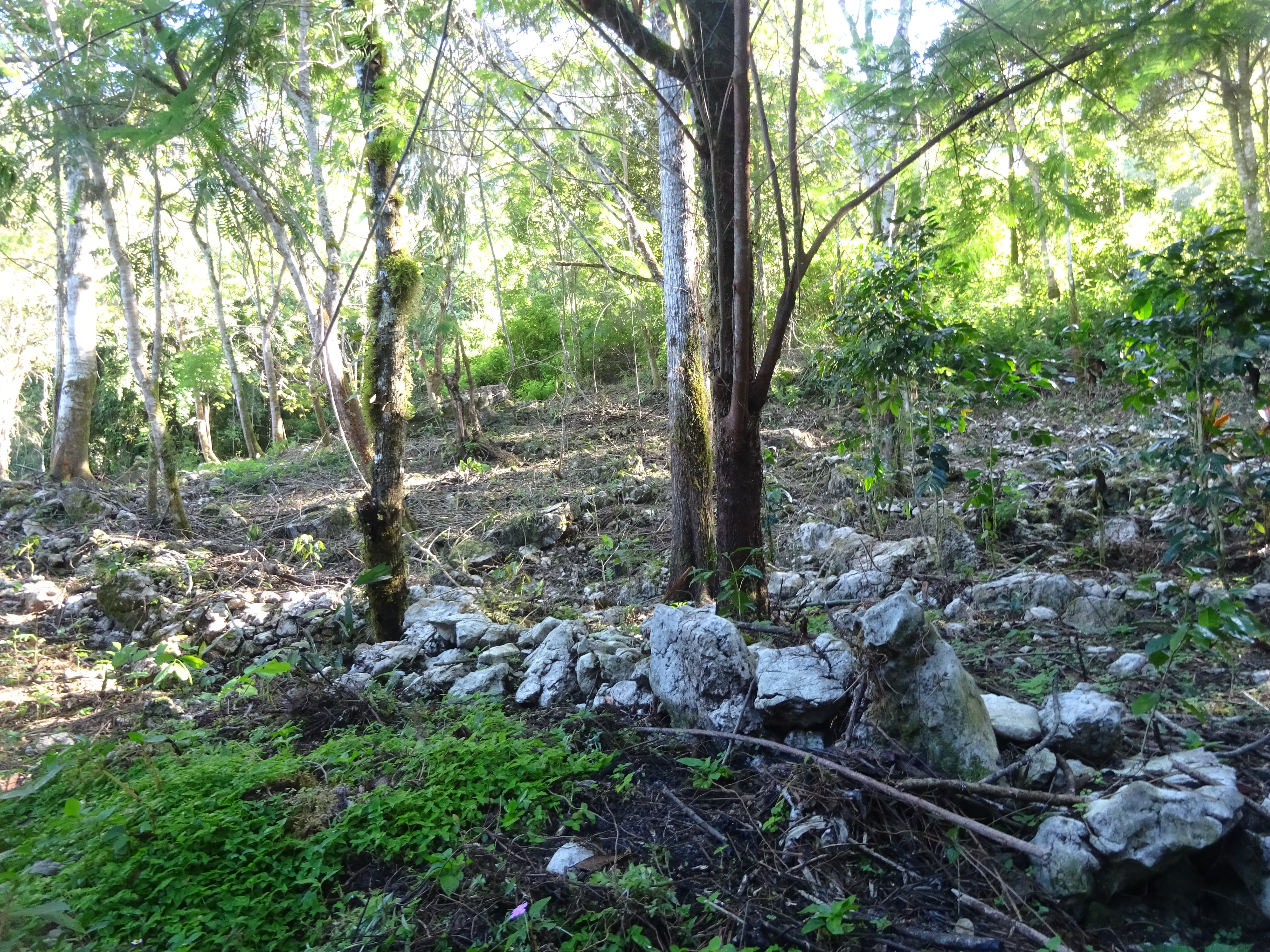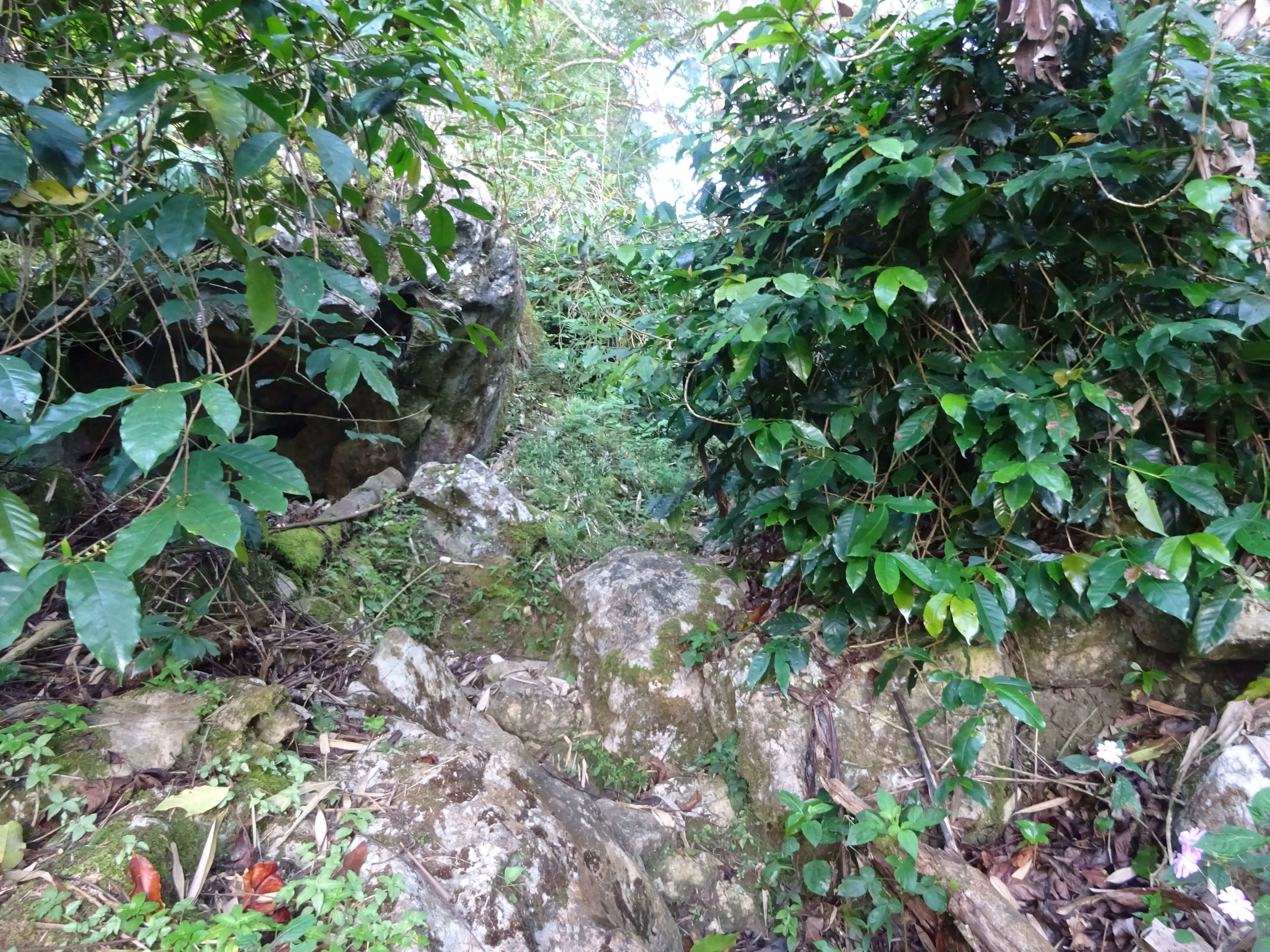 Follow this path through coffee plantations before reaching a small wooden hut (1,455m). This is assumed to be Pos 1. Beyond the hut is a small pool of water (1,491m). Local hikers have tied bits of blue and green plastic to branches which help with navigation. Next is a rocky area (1,534m), which looks like an accidental walled garden of some sort. The views here to hills on the other side of the valley are great.