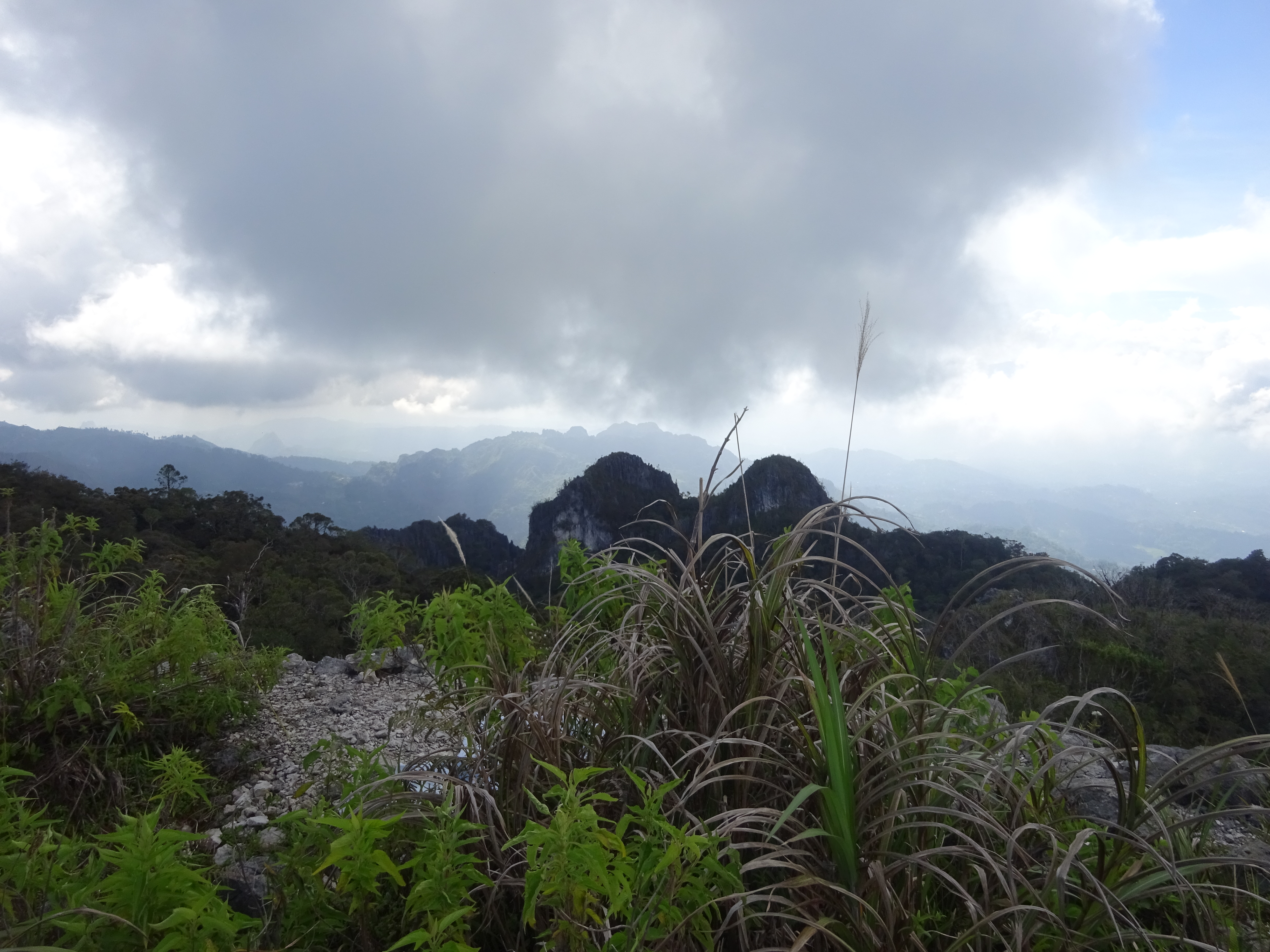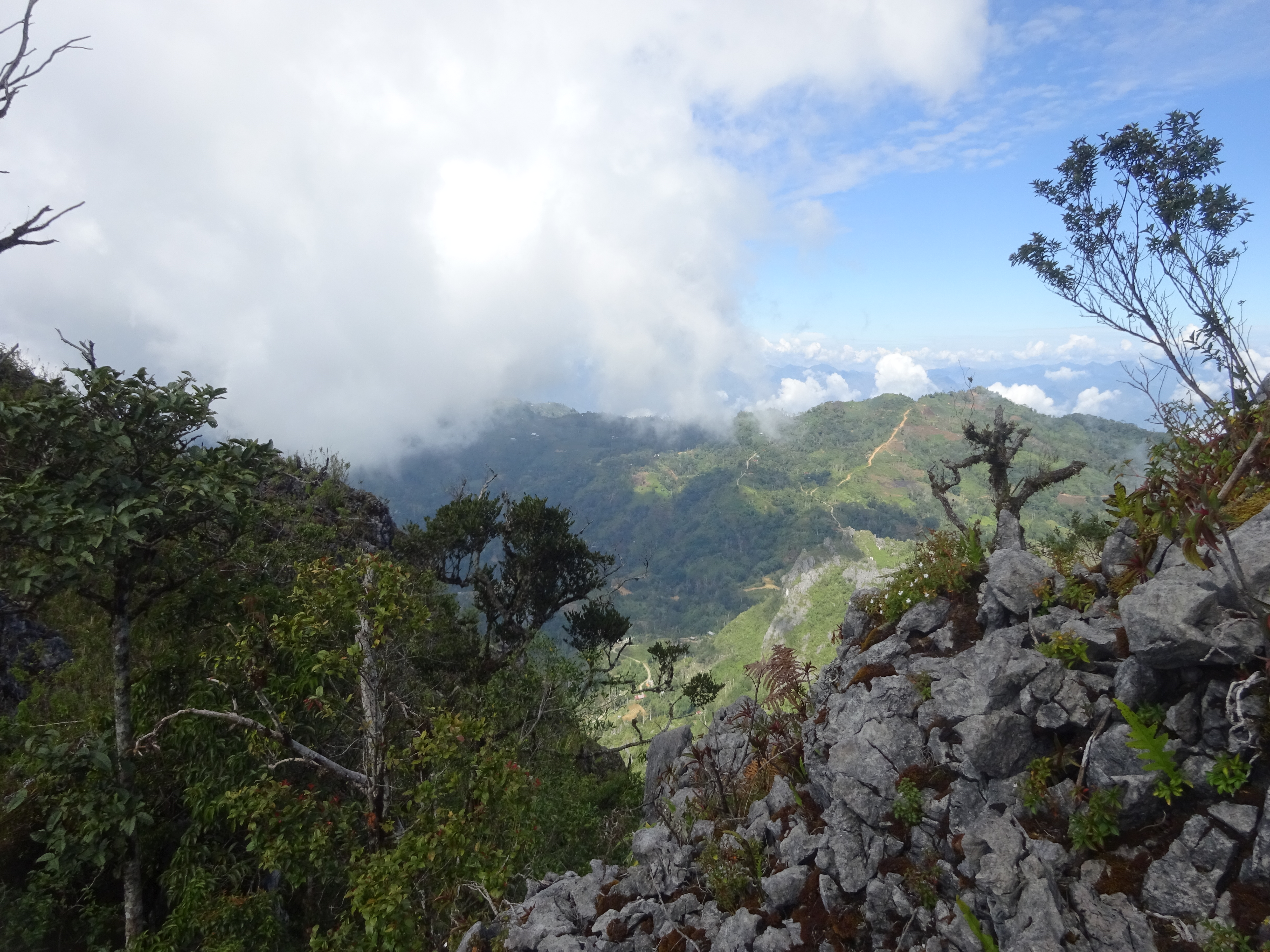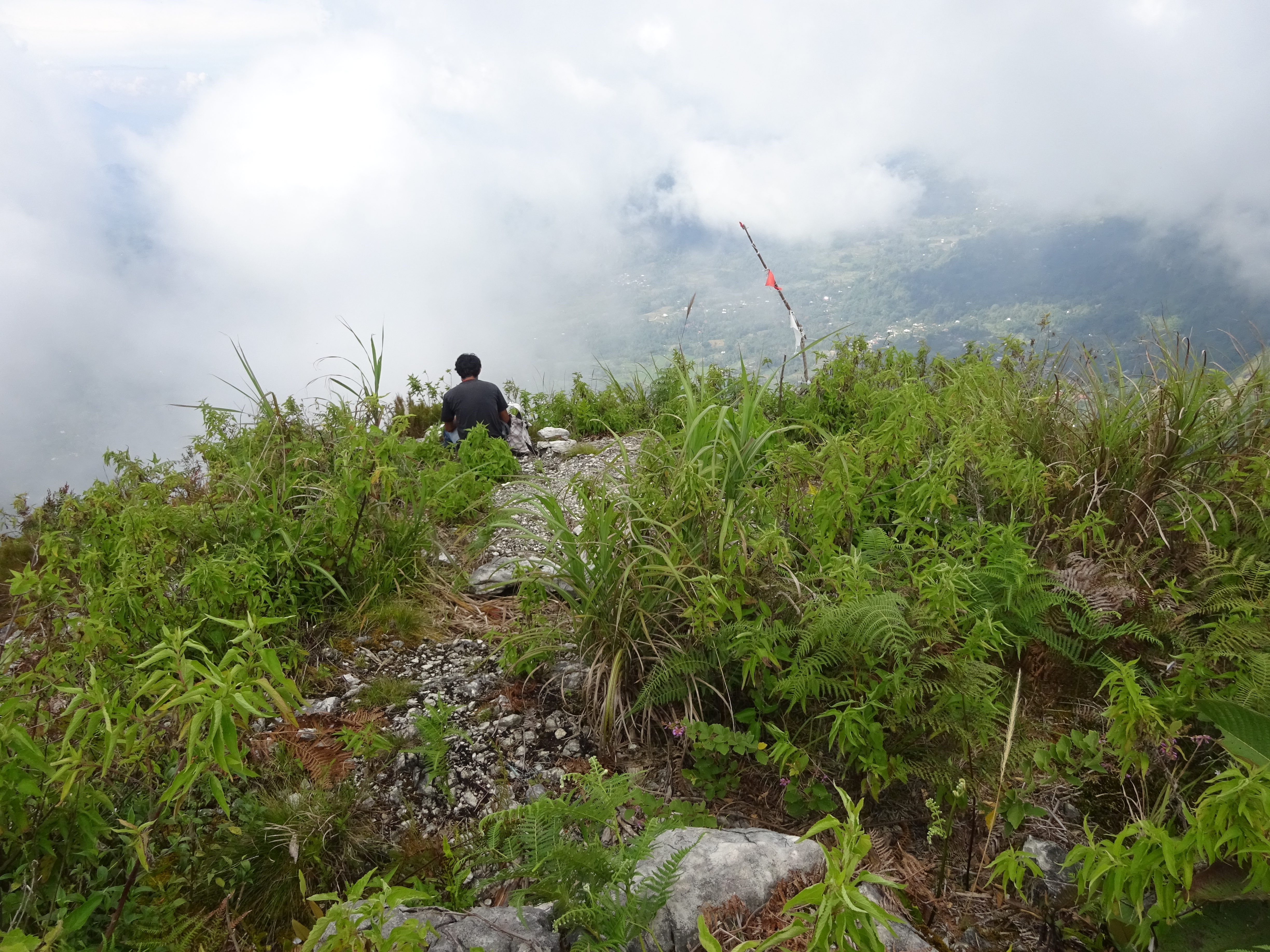 The trail enters mossy forest (1,914m) before leading steeply up to a mini ridge (1,980m) where the trail emerges from the forest behind the rocky knoll. Take a left on the ridge and follow the trail for just a few minutes to a large rock where there is a sign for Puncak Sesean 2,100m. Be very careful on this rock, because on the other side is an immense vertical drop! Despite what the sign says, this spot is around 2,013m high. However, it is a very worthwhile point to reach.
