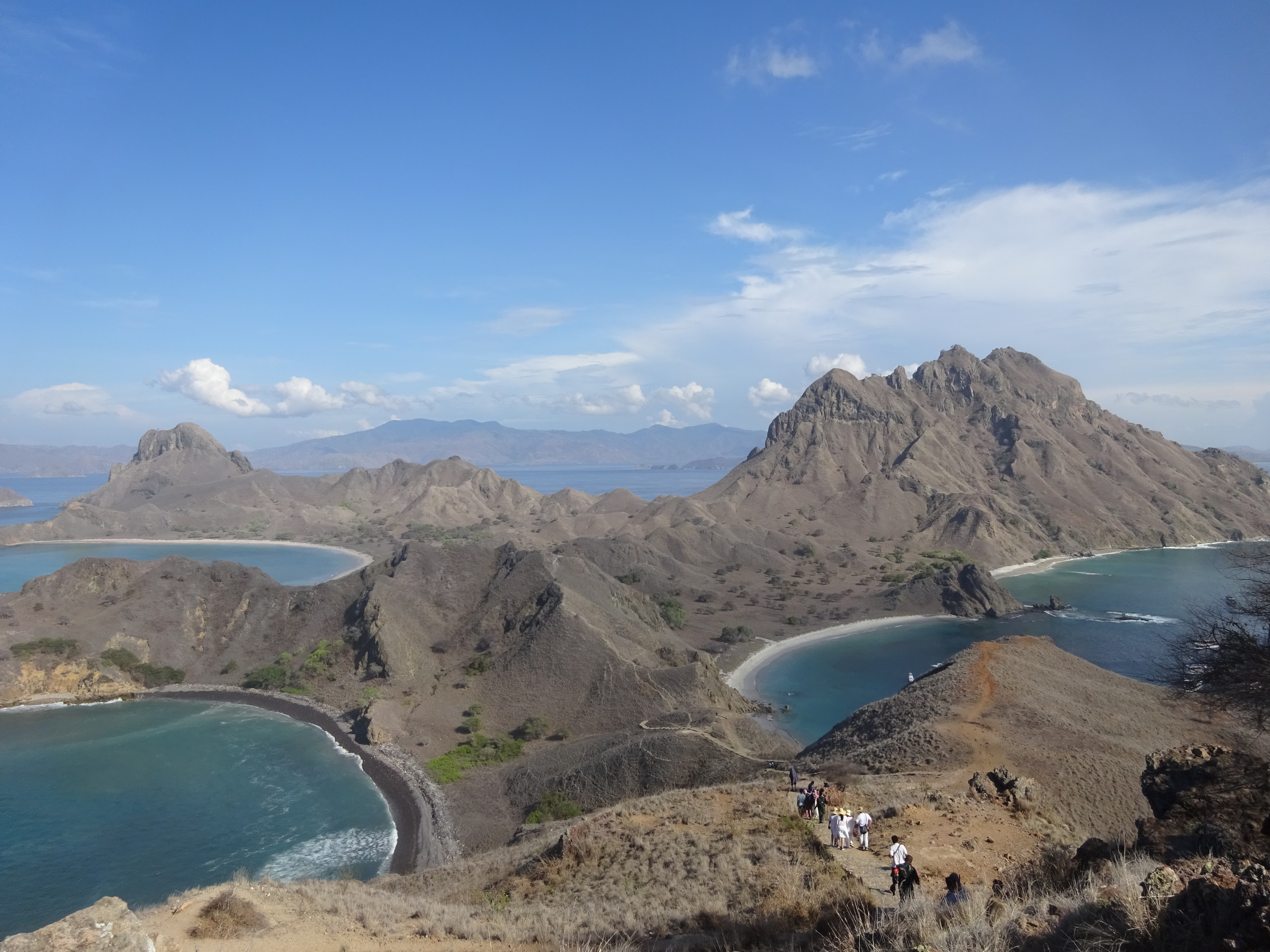 Padar Island is quite rightly famous for its spectacular scenic panorama from the viewpoint. Our one day boat trip called off there first, and the views first thing in the morning once you get out of Labuan Bajo itself and out onto the water are incredible. The hike up to the viewpoint takes around 20 minutes, with a couple of intermediate rest points with increasingly panoramic views as you get higher. We met one ranger who said he had been attacked by a Komodo dragon on Rinca some years ago but was ok now.