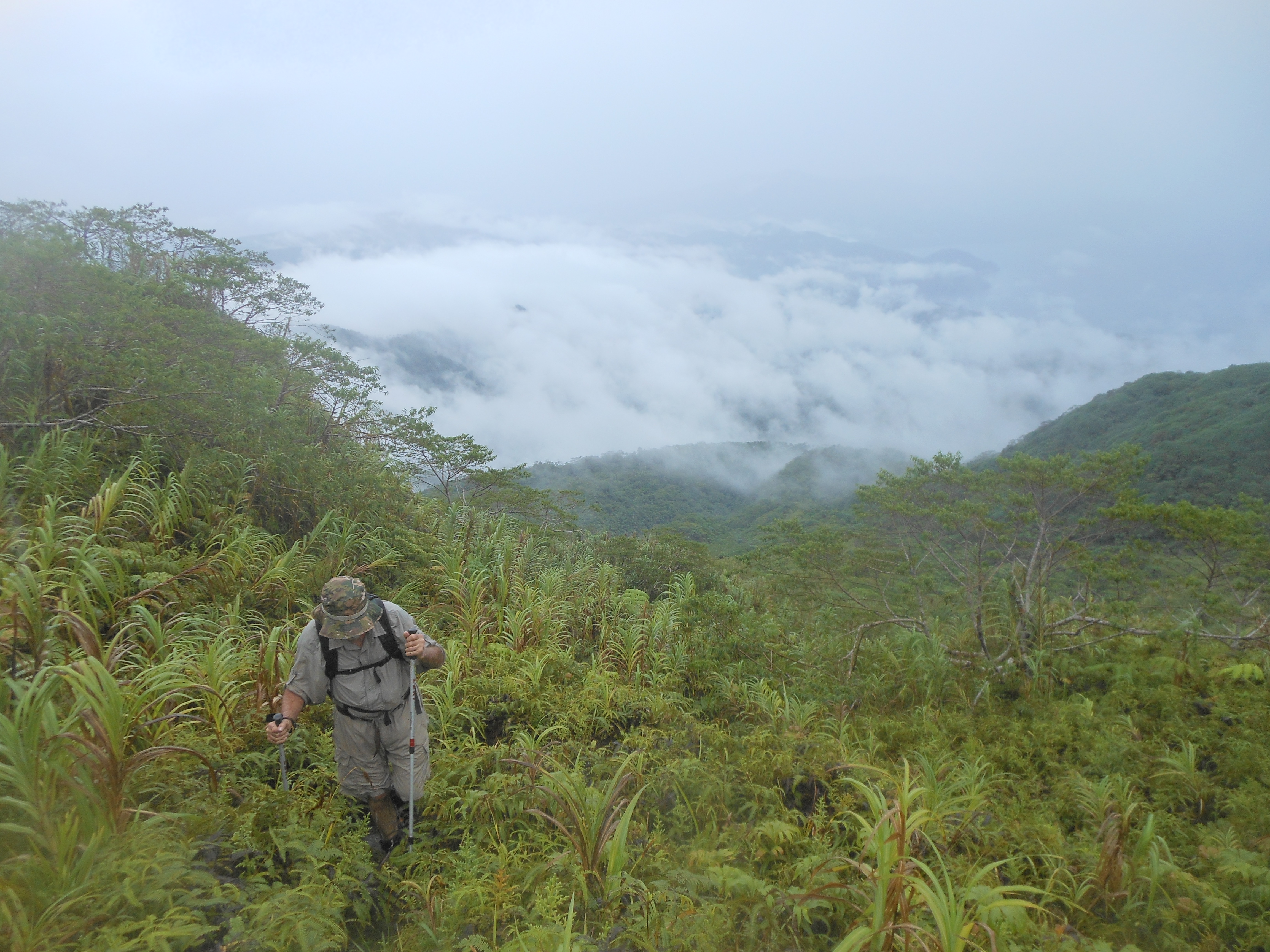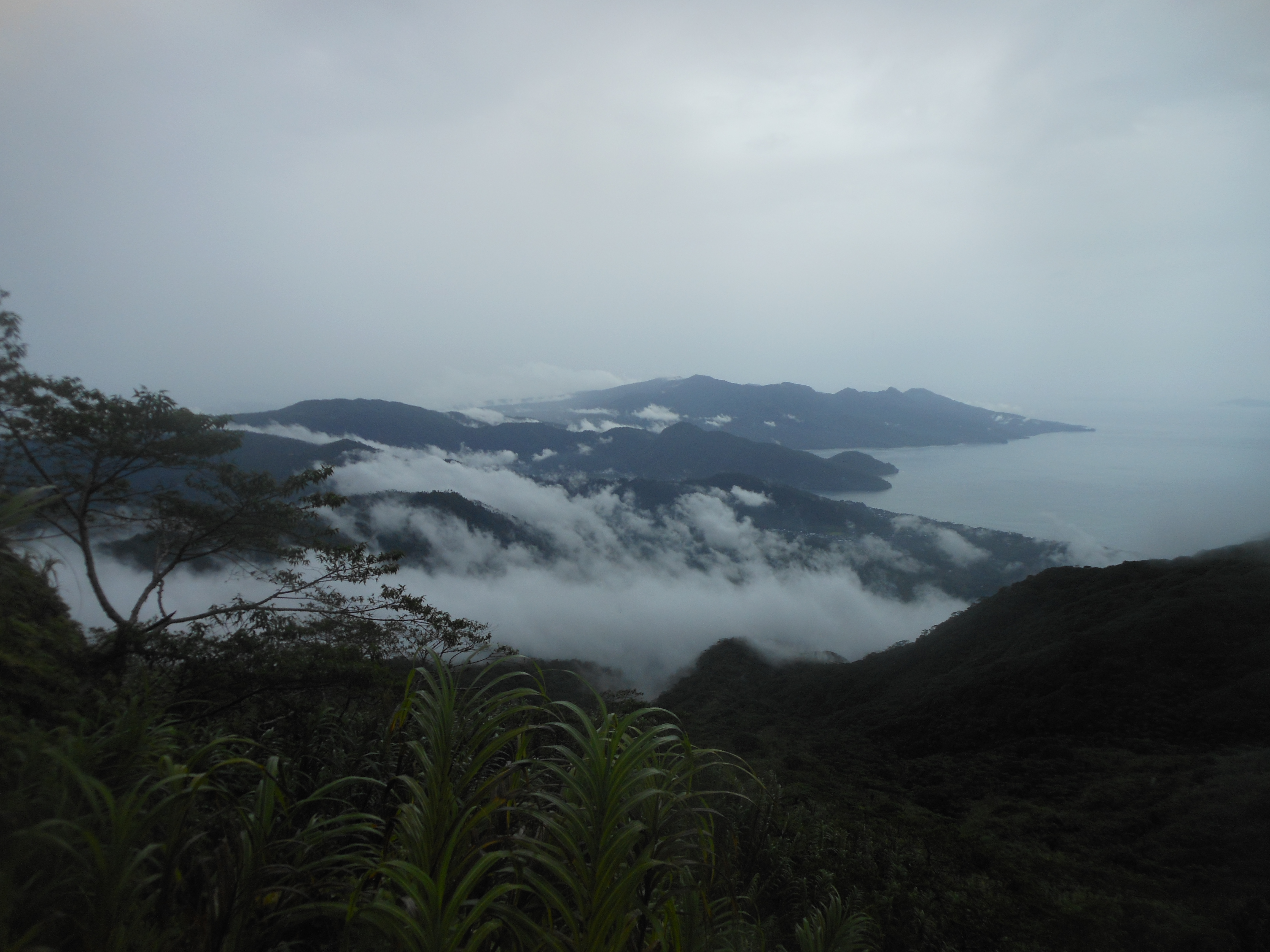 The usual trailhead at Kampung Angges is just 10 kilometres or so from the main town of Tahuna and at less than 100 metres above sea level. After reaching the end of the road (138m), the pleasant trail leads up through coconut plantations, via several huts suitable for taking a rest, and several areas with Pos signs. A particularly nice hut is at 399m just after a steep section of trail. A little further along you will notice what appears to be a volcanology sensor near Pos 6 (574m) which is reached in about 2 hours in total from the start. It is clear that the volcano is climbed fairly often by local hiking enthusiasts but there is very little litter despite people camping here. There are a few leeches but they seem to be a lazy variety that can be pulled off incredibly easily. Not much further on from Pos 6 the forest clears and there are great views back down to Tahuna bay and the southern side of the island. The trail follows a ridge with medium height vegetation – and one large rock you need to climb over (713m) – and the views remain generally good from this point on.