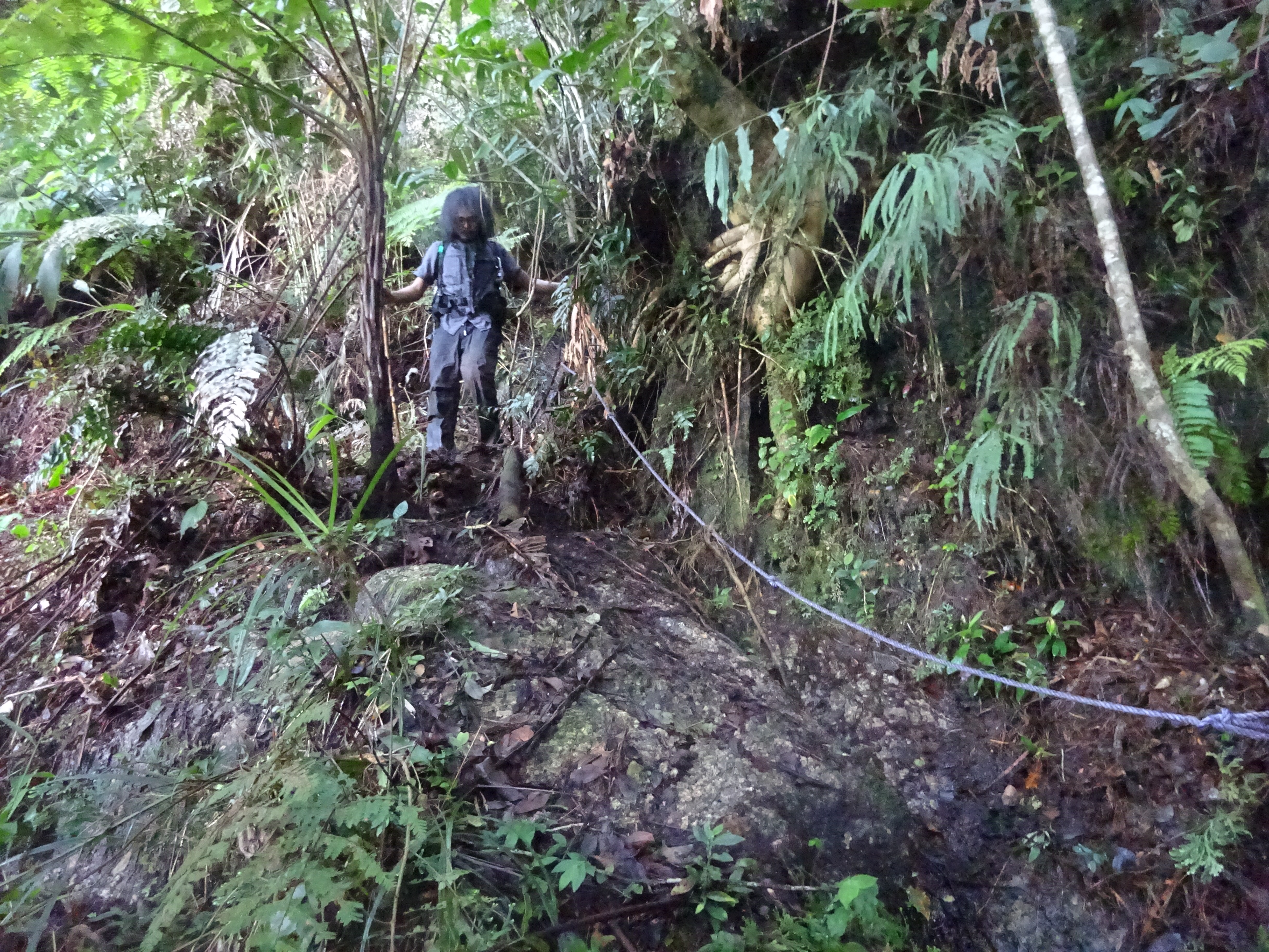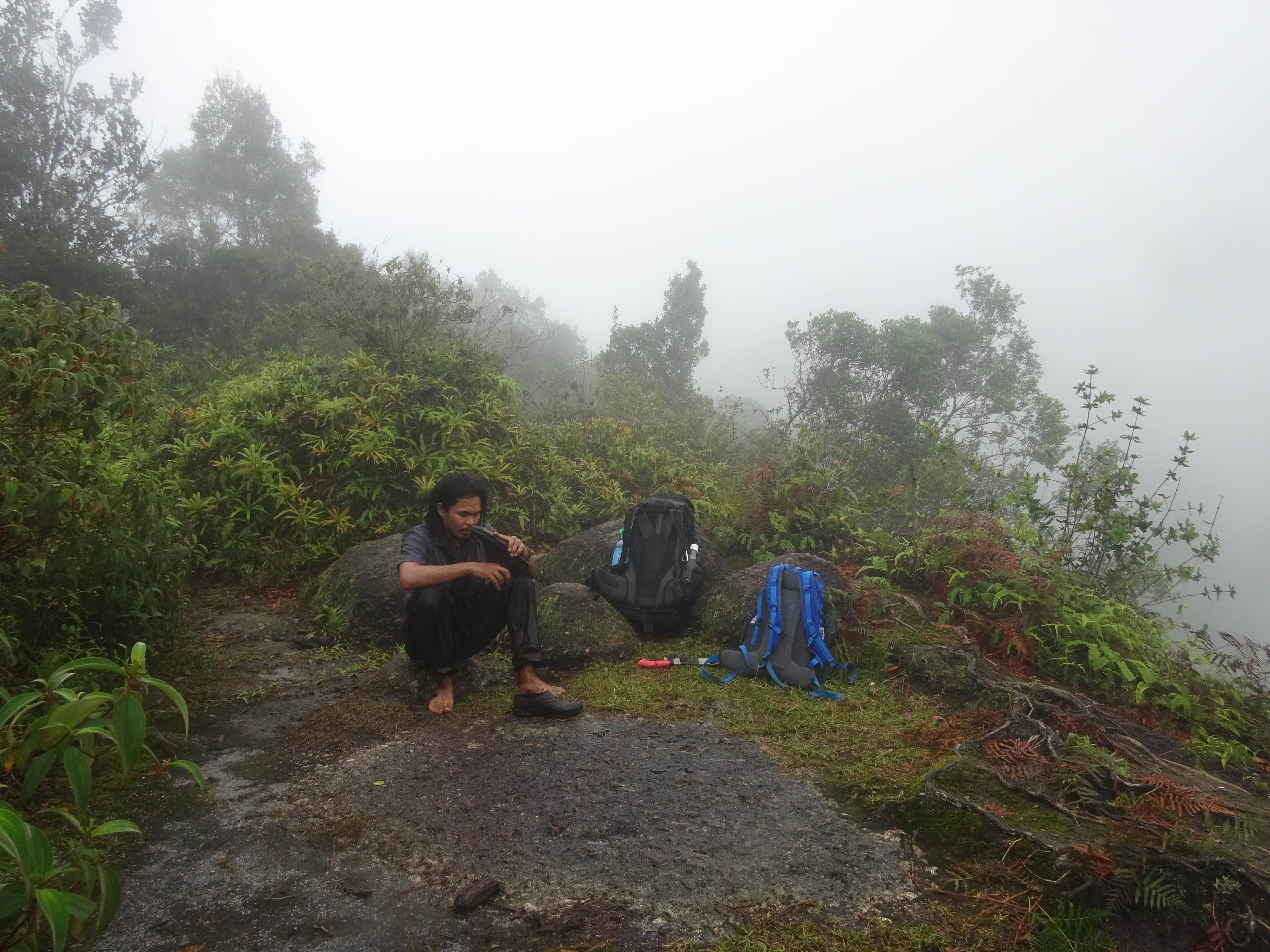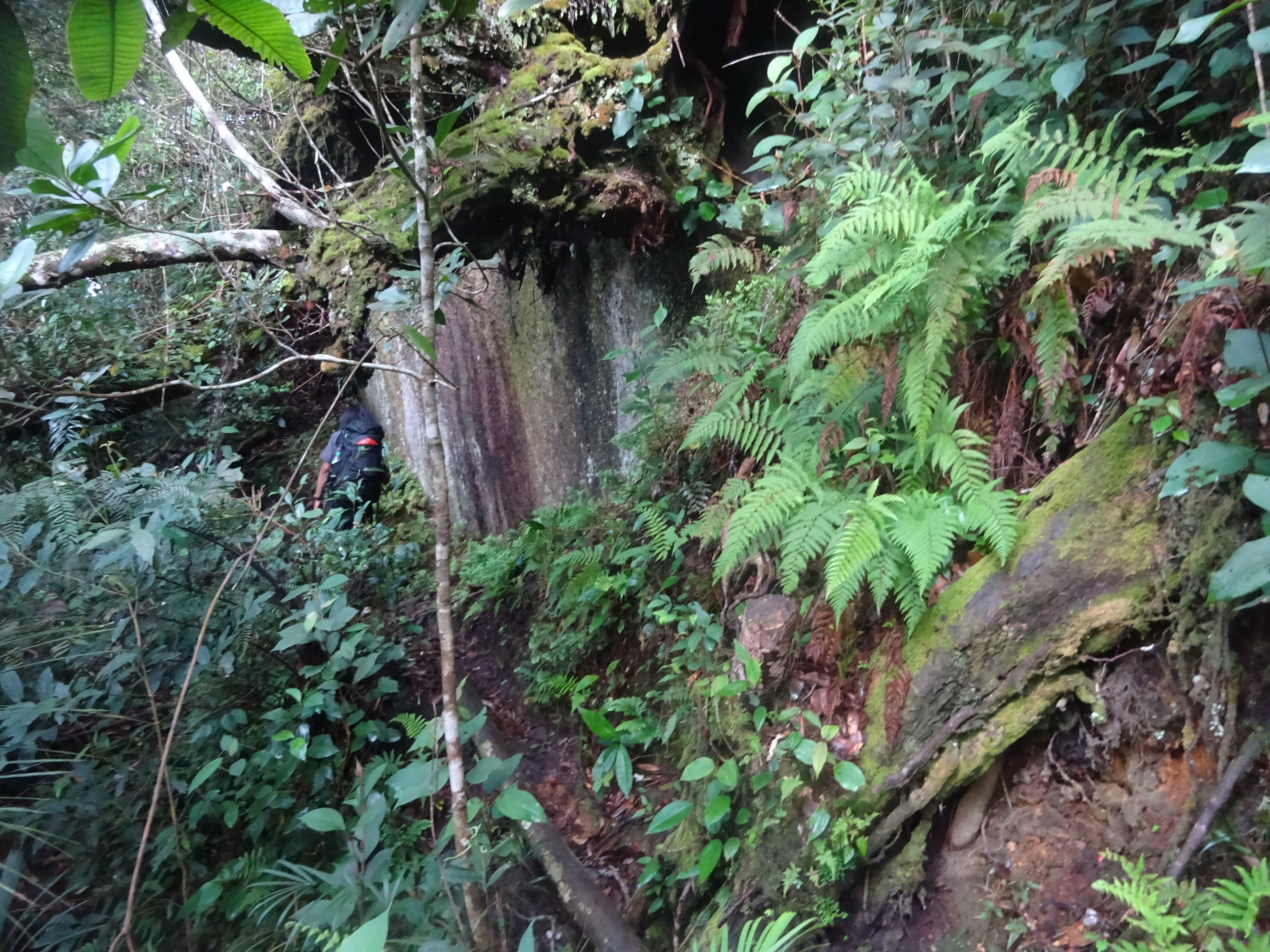 Beyond this point, the trail heads down a little before reaching Kem Anaconda (1,740m) after about one hour. The flat ground here is almost non-existent, with tree roots making it a bad choice. You will already have been able to hear a waterfall down below to the left. This is known as Air Terjun Terbunuh and is the last water point on the trail but requires a steep and considerable descent from Kem Anaconda so, once again, best fill up earlier at Gua Azan or before.