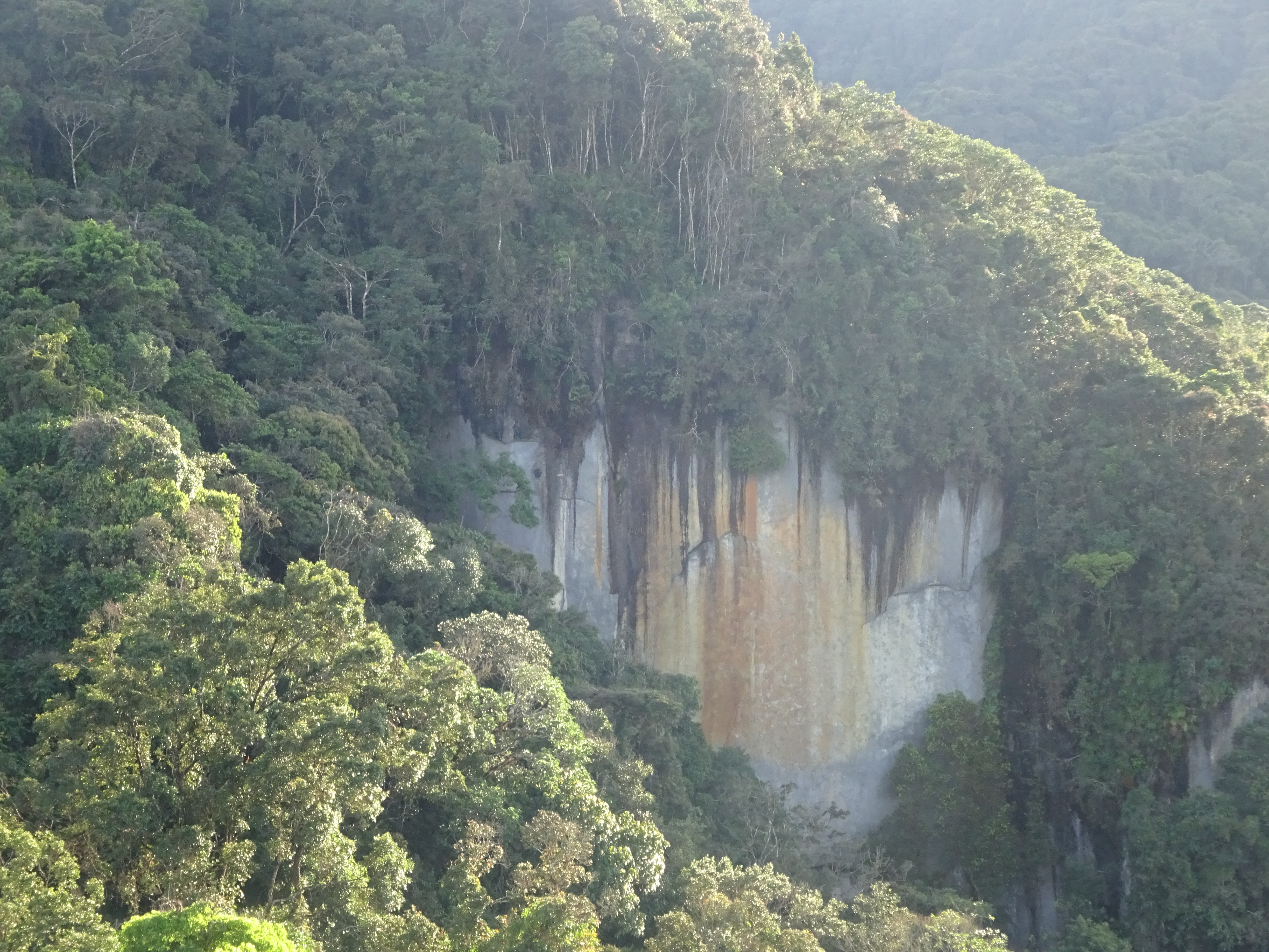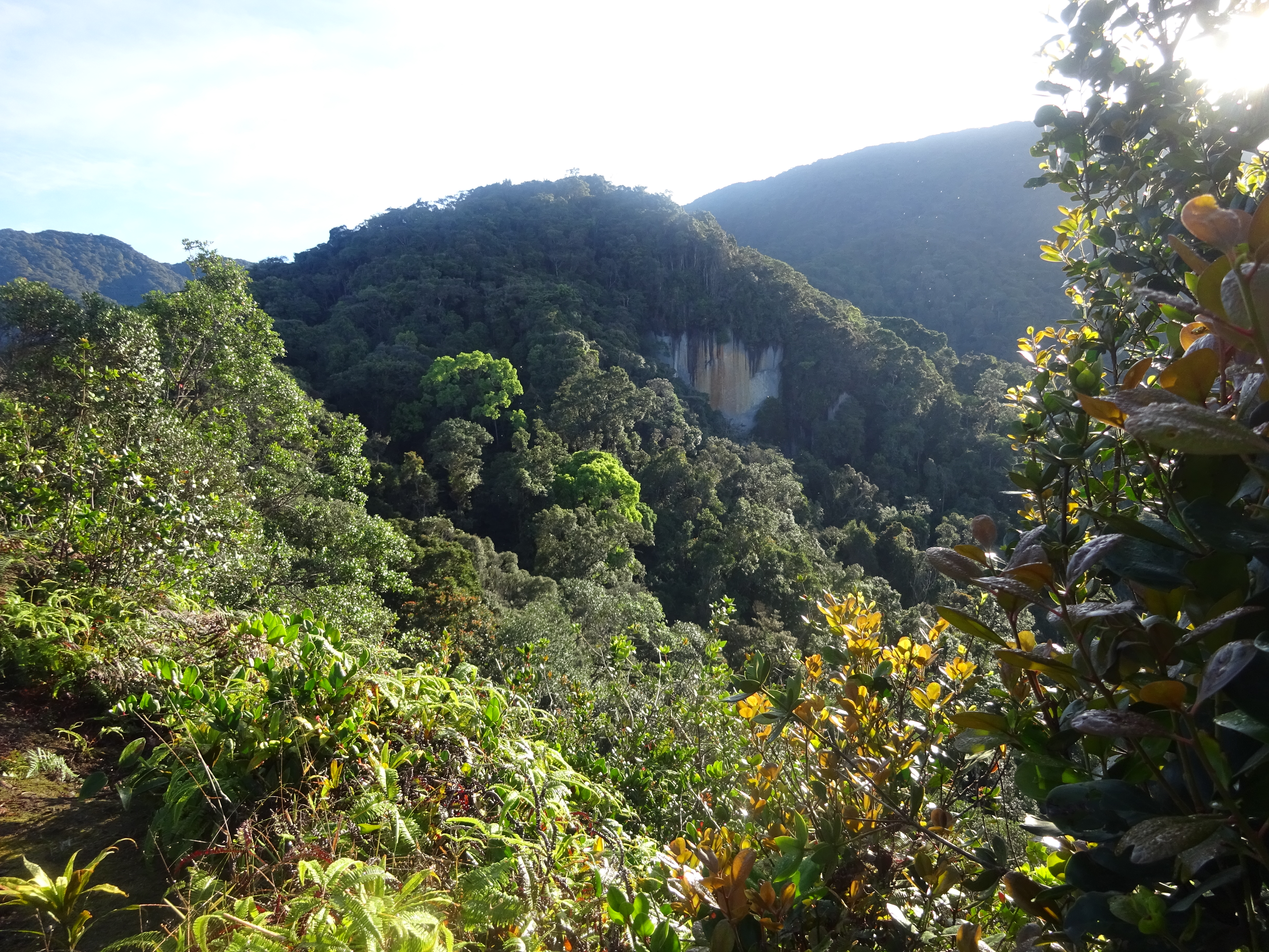 At the top of this is a great viewpoint, known by some as Gunung Lintang or Gunung Batu Kak (1,455m). Be aware of the lack of clarity on names if taking a guide from the Orang Asli village, as some reports have said that this was as far as the local guide wanted to go. In clear weather you can see the true summit ahead of you plus a lower peak before it featuring a substantial and beautiful pale cliff-face. This cliff is what gives Batu Putih its name.