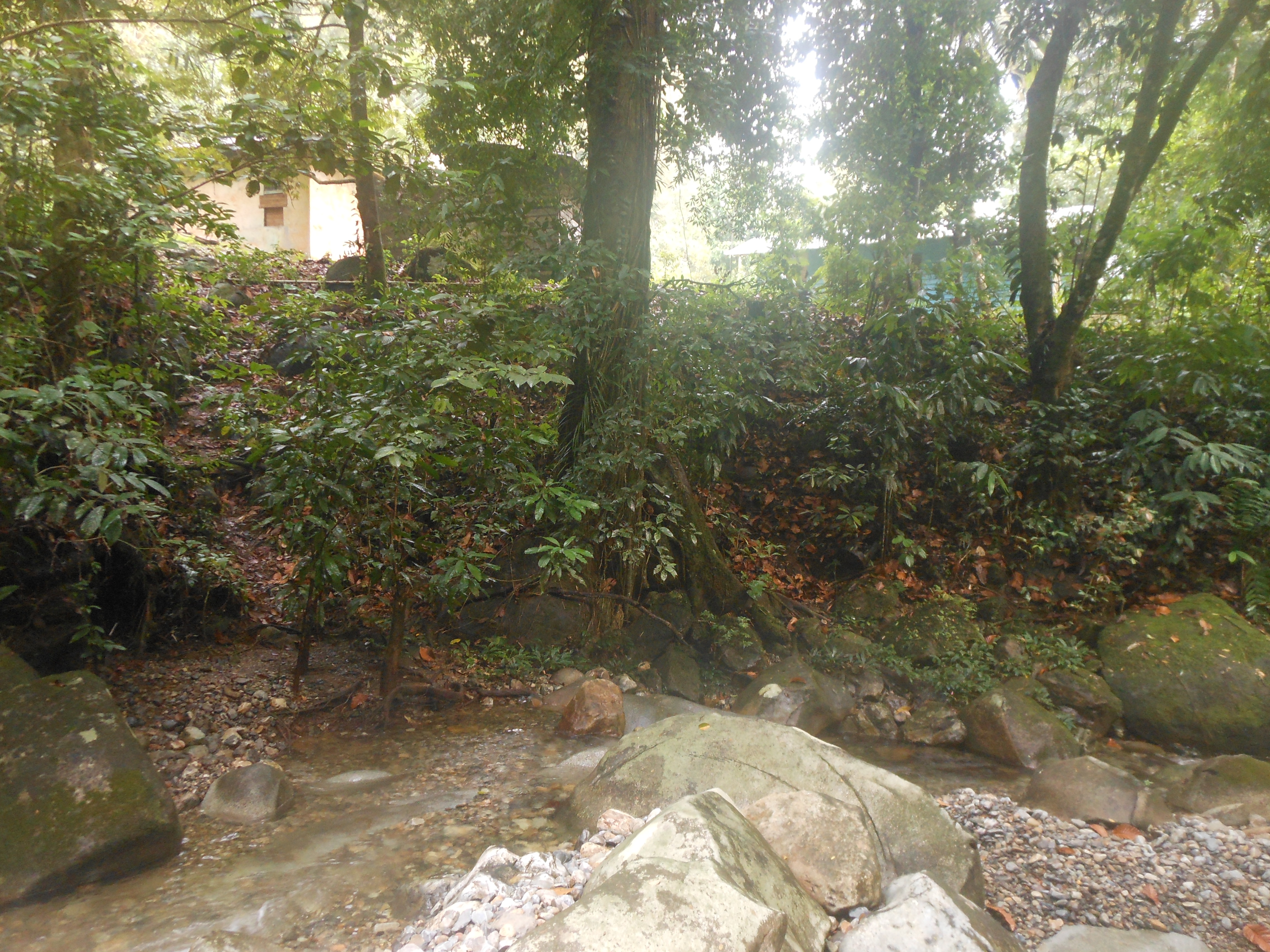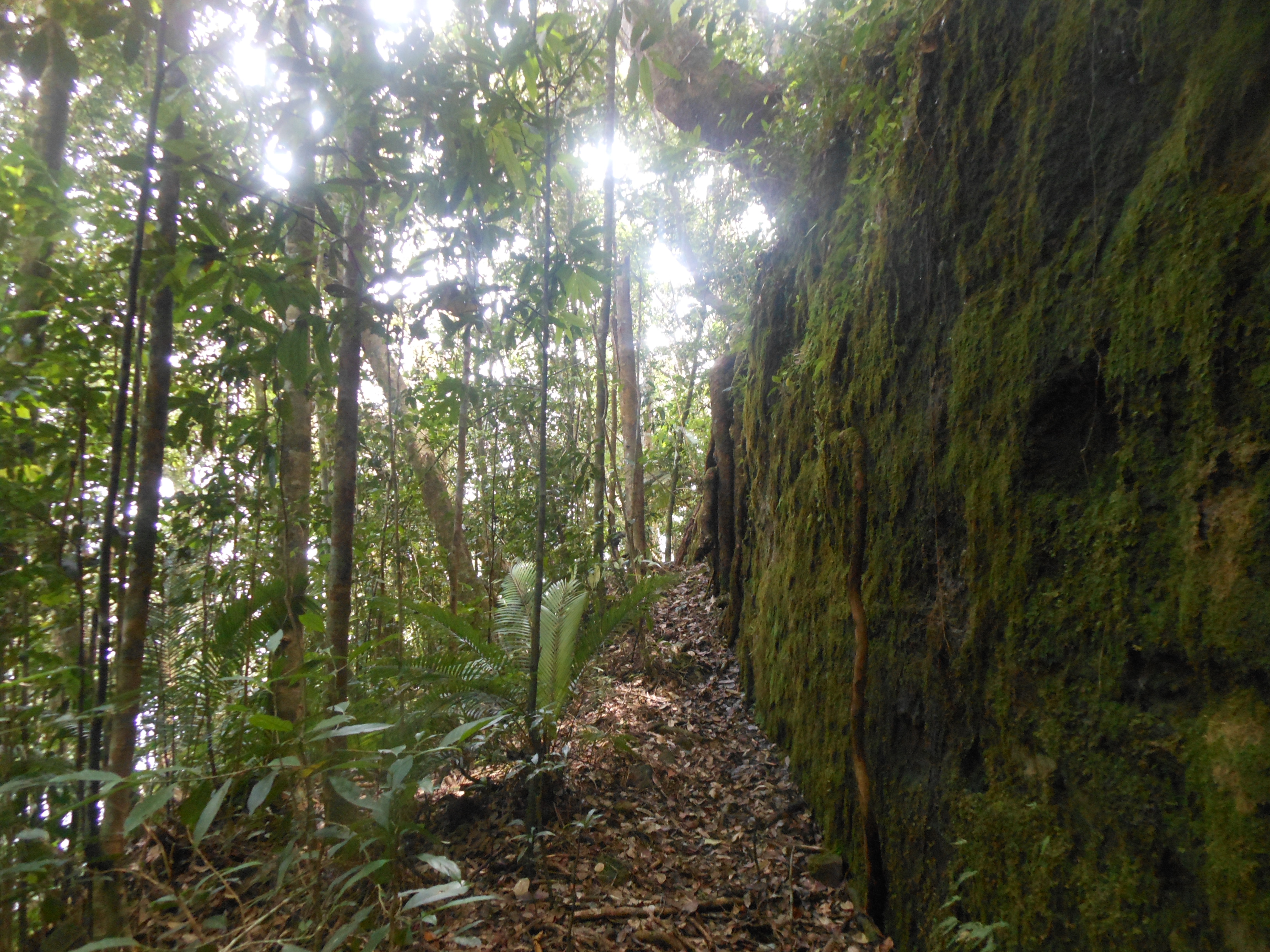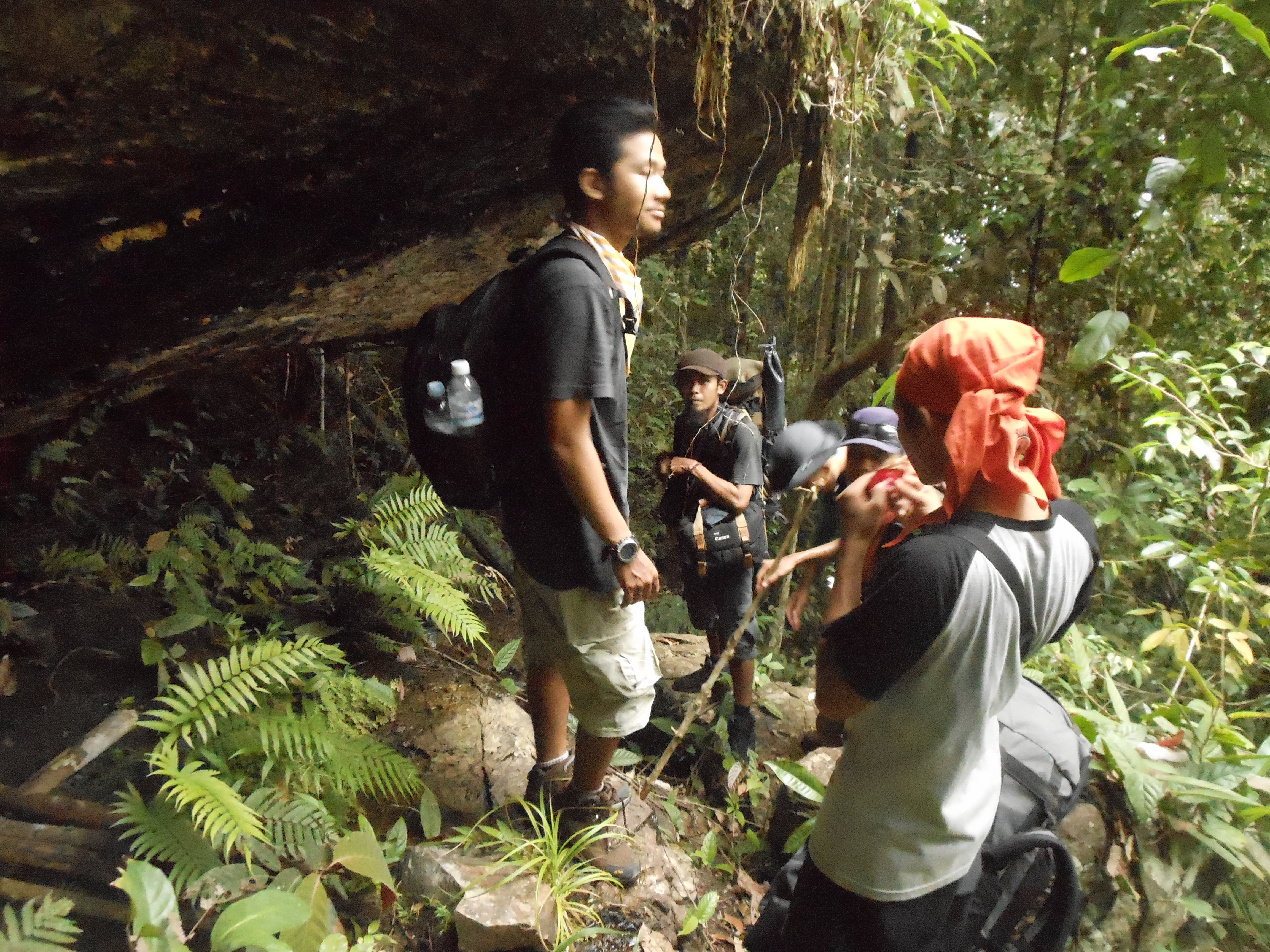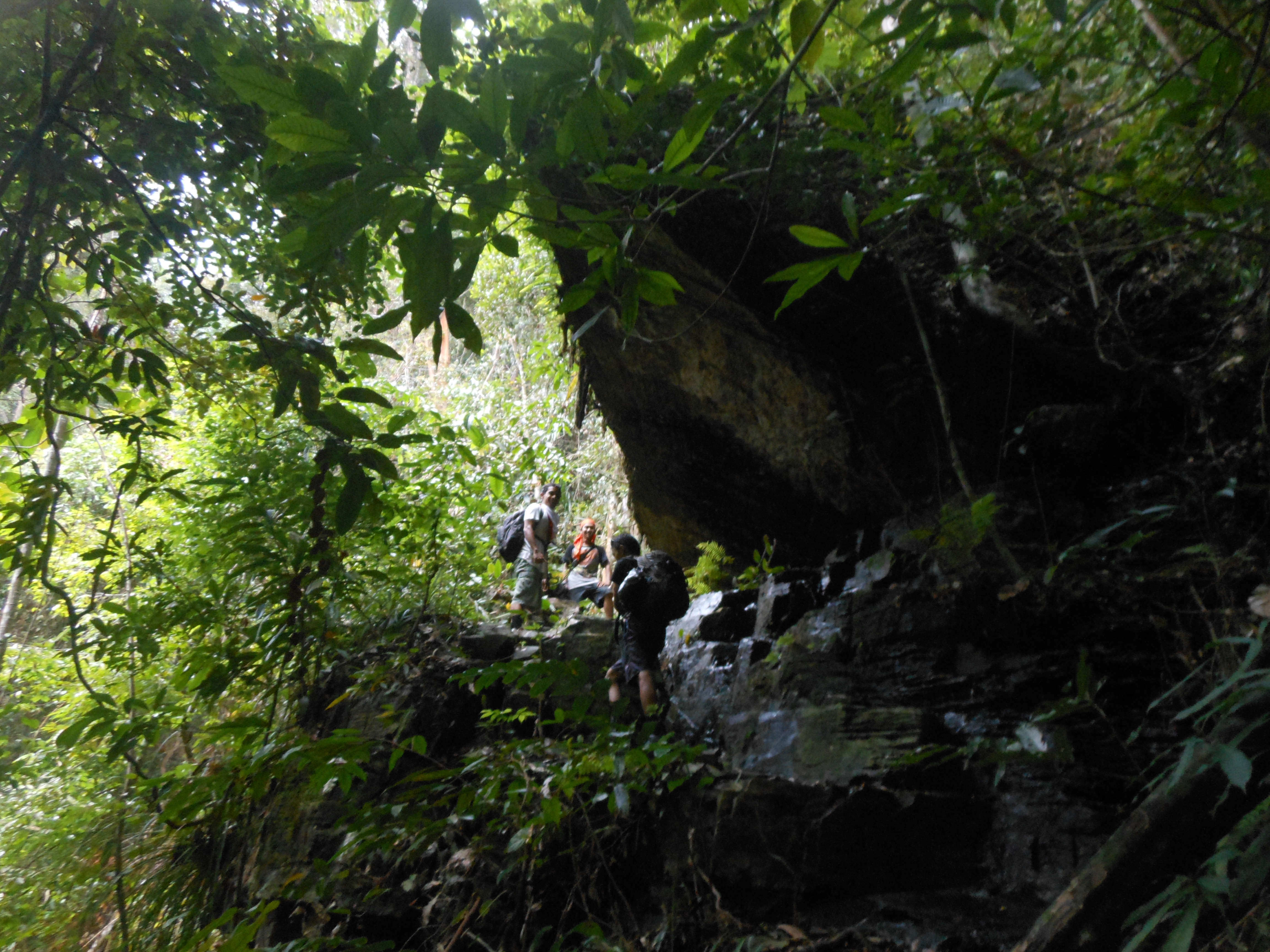 The hike proper begins behind the basecamp buildings. First you must cross the river itself (prepare to get your feet wet on this hike!) before ascending up to the right. Little black plastic bits of string tied to trees mark the route every hundred metres or less but even so it is easy to get lost here even with a GPS. There are lots of birds to be heard and occasionally seen in the forest and you should be able to hear the hornbills at an elevation of around 500m. At about 523m is a rock which looks at first like a man-made wall. It is the first of many rocks and cliffs in the middle section of the trail, some of which require careful scrambling and the use of all four limbs to clamber up near-vertical walls and roots. At 569m is a minor cliff-face with water often dripping from it.