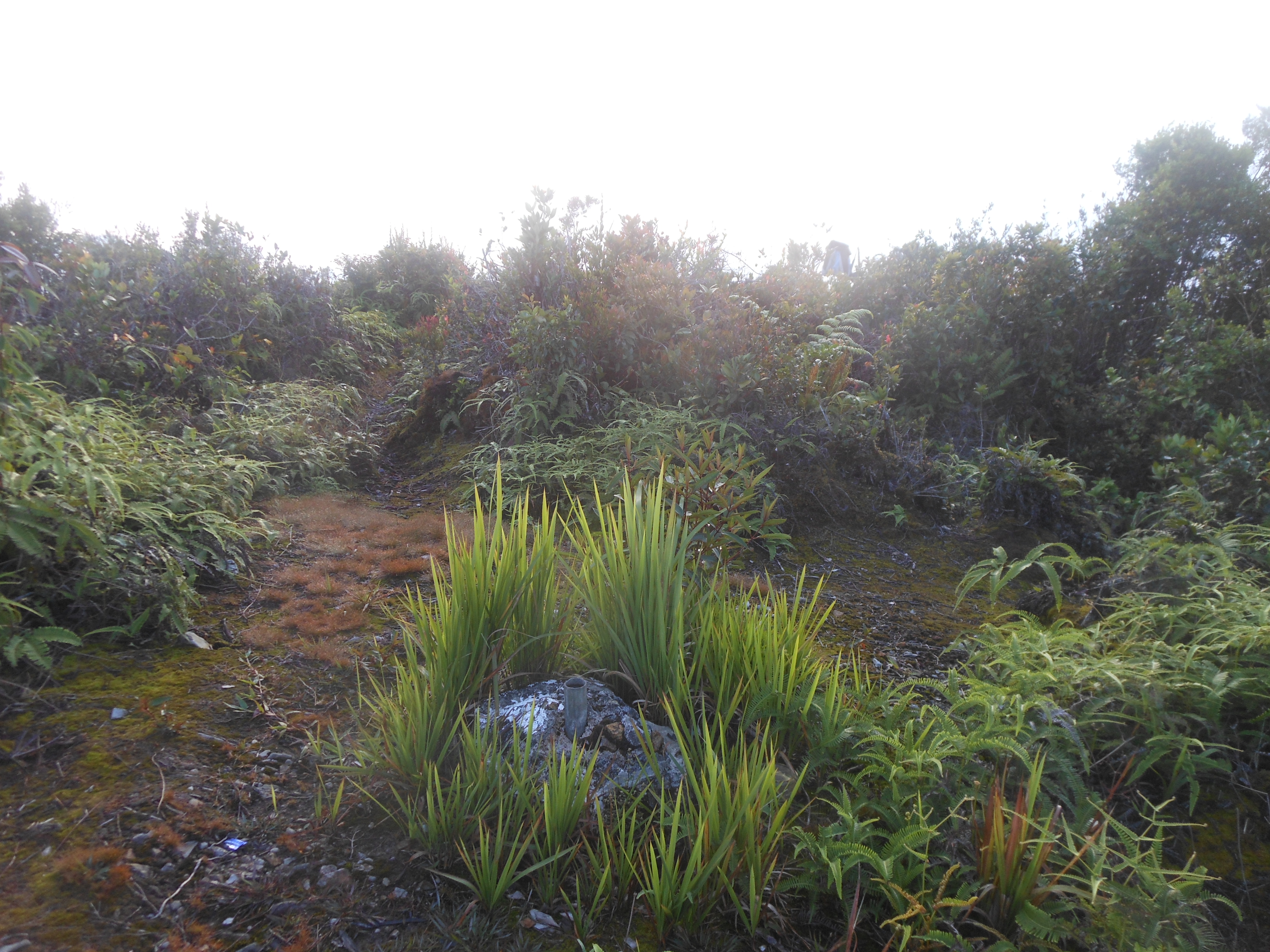 ‘Puncak 2’ (1,235m) is reached after another 20 minutes or so and once again there is space for tents. By this point the vegetation has changed remarkably and there are orchids and moss and occasional pitcher plants. The trail drops down before ascending steeply again. Another spot at 1,336m in the middle of the trail (perhaps you could call it ‘puncak 2.5’) is reached before the views of surrounding mountains and valleys below begins to open up dramatically. The true peak ‘puncak 3’ is delightful and because of the lower vegetation offers stunning views in all directions. There are two cement summit markers and a couple of tiny water pools which are reasonably reliable during the wet season.