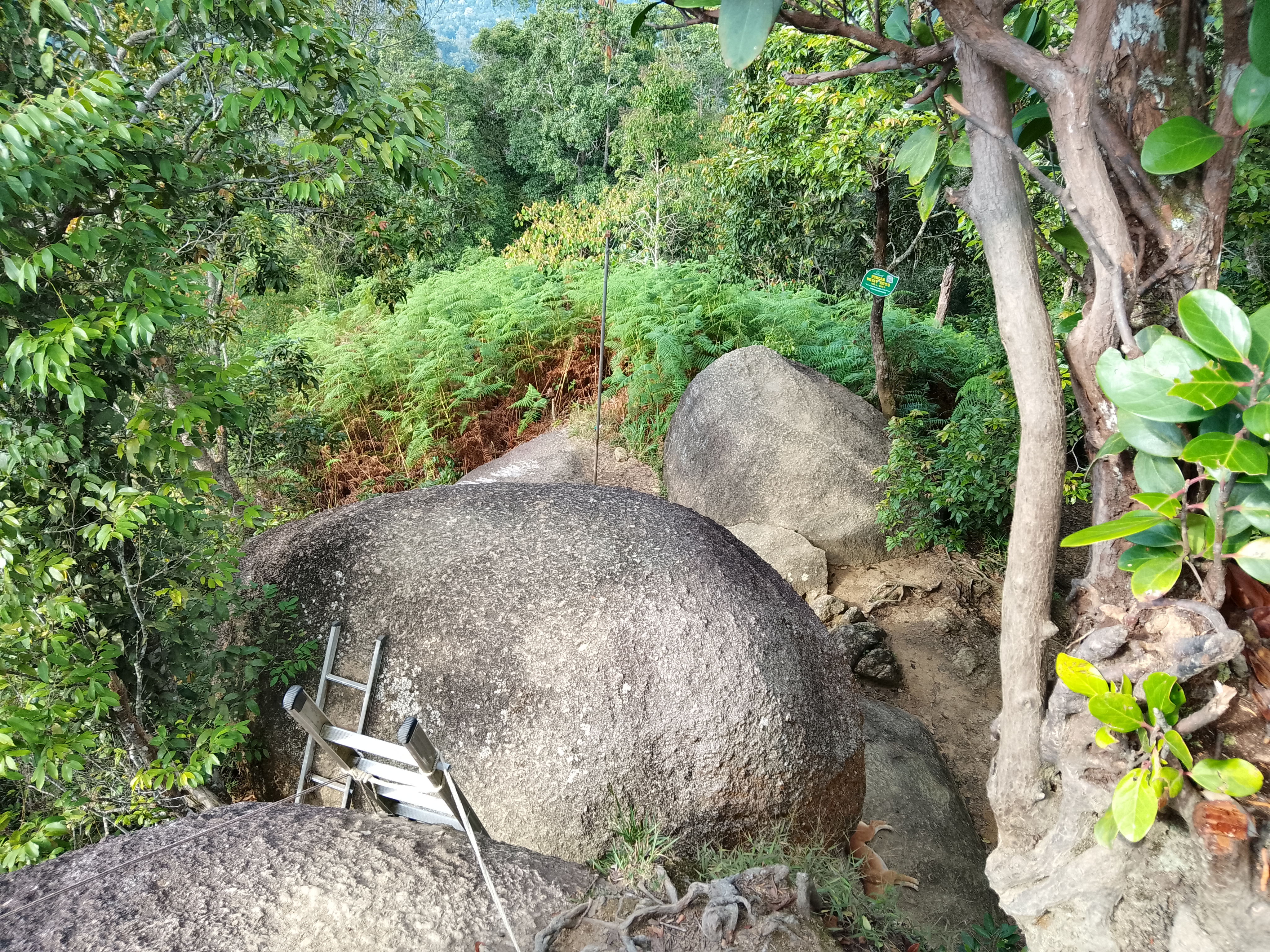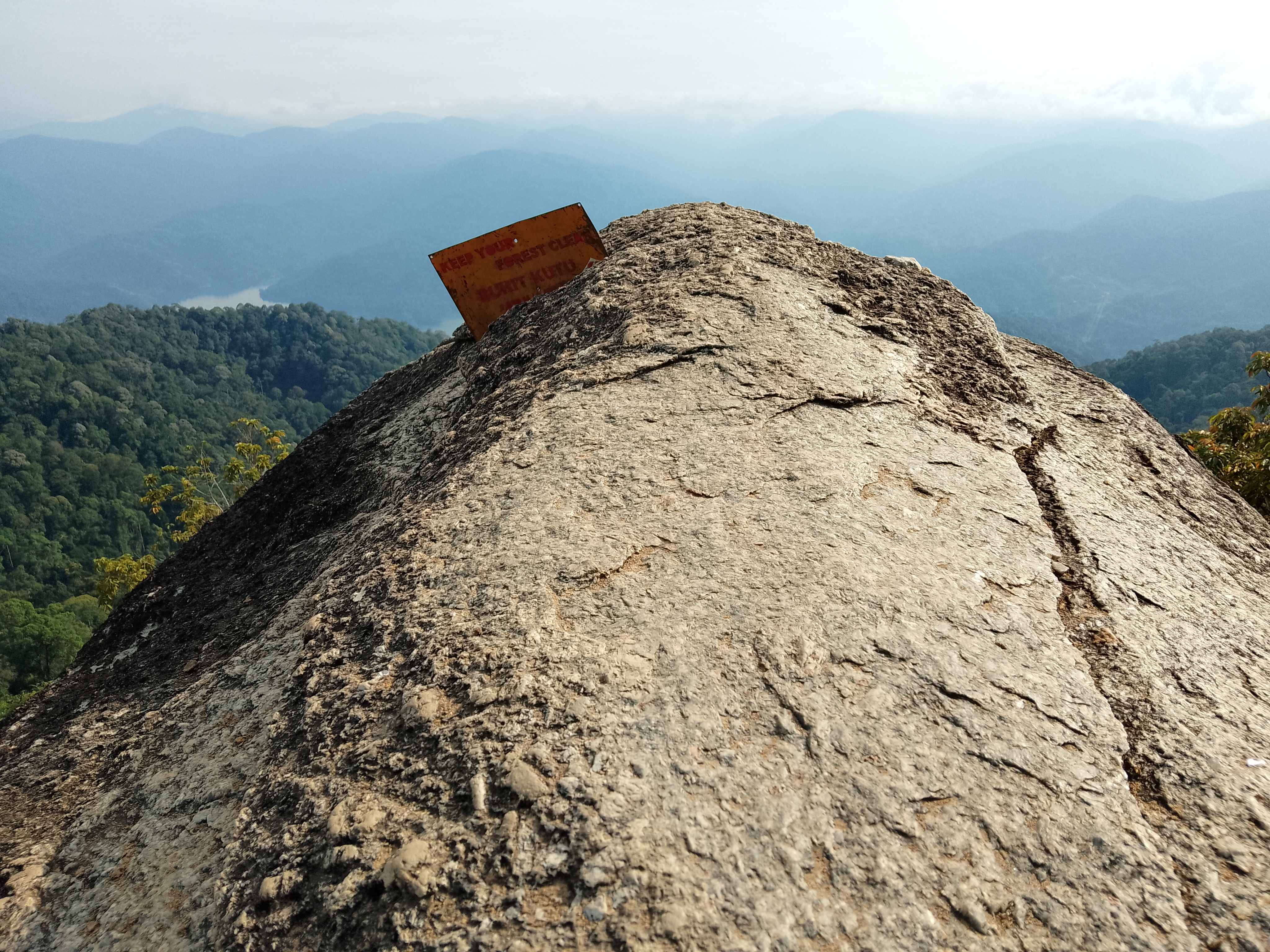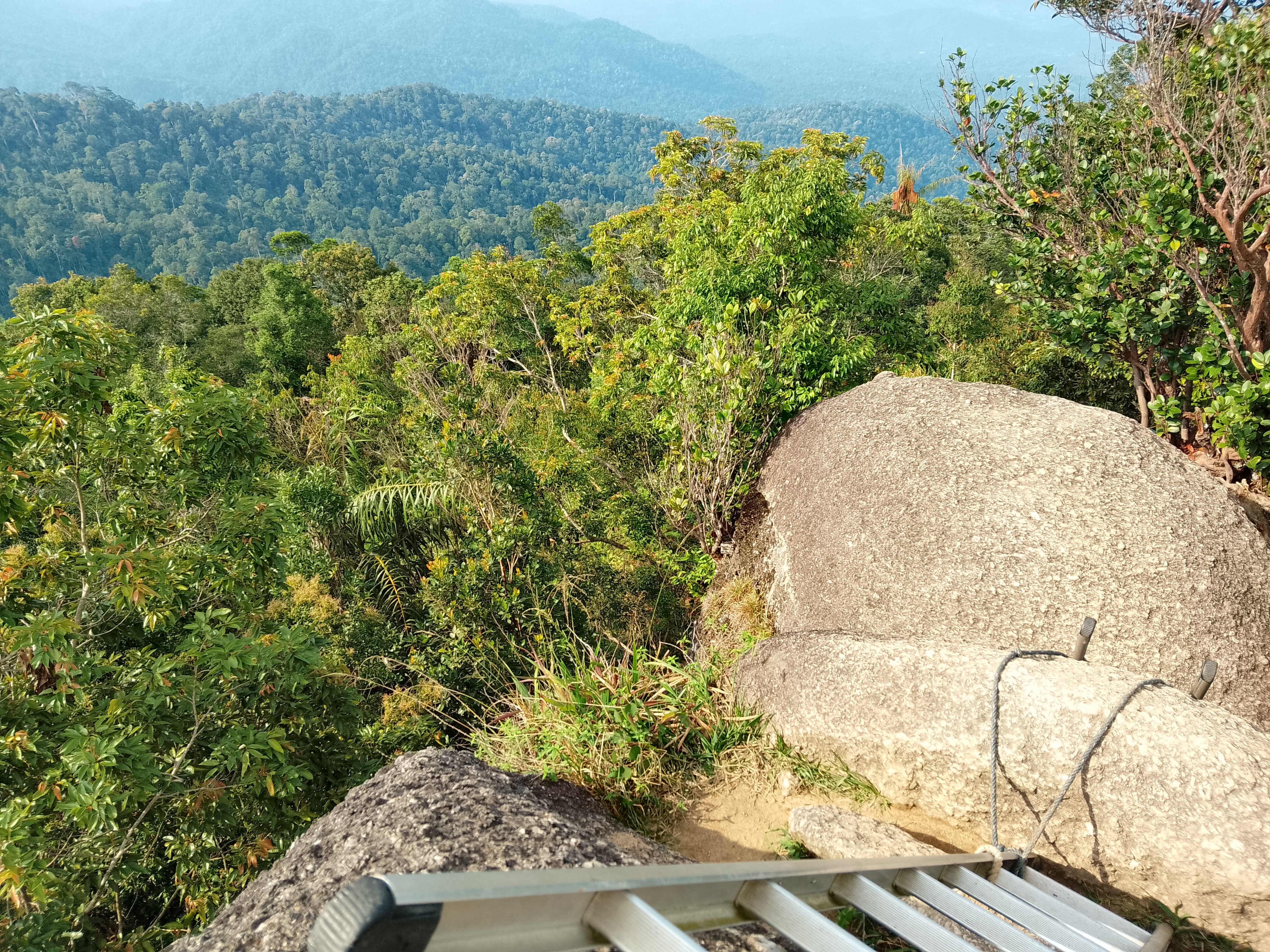 The Bukit Kutu summit boulders are just a few minutes beyond and above the bungalow chimney. Most online sources state an elevation of 1,053m but this seems to refer to the ground at the base of the boulders where there is a cement block, possibly once used for map-making. Based on GPS readings the true elevation at the top of the rocks appears to be in the region of 1,070m. Take real care on the boulders, which are a cluster of smooth egg-like rocks with ladder sections tied with rope to them. From the top you should be able to see beyond the Selangor river reservoir below to the peaks of the Titiwangsa Range northwards near Bukit Fraser (Semangkok, Twin Peak, Pine Tree Peak, Gunung Gap, Gunung Ulu Semangkok) and eastwards towards Gunung Rajah.