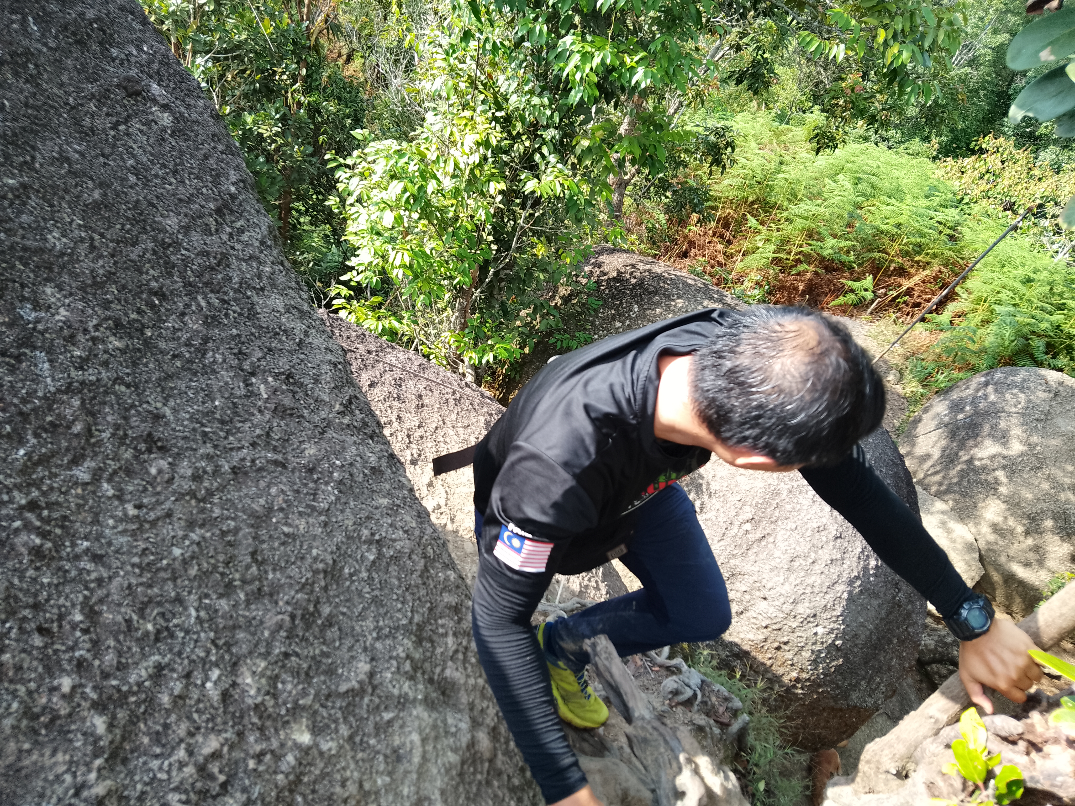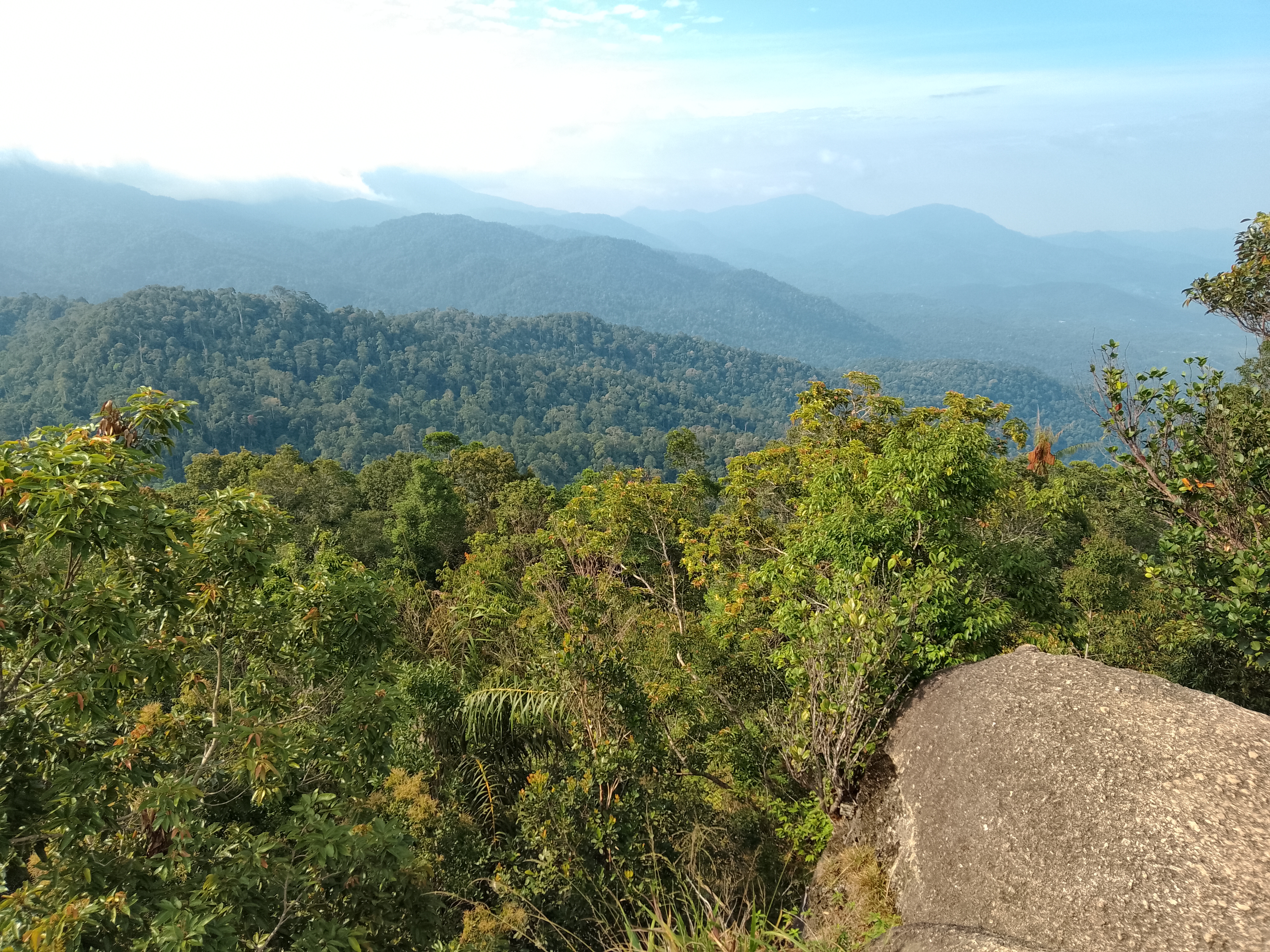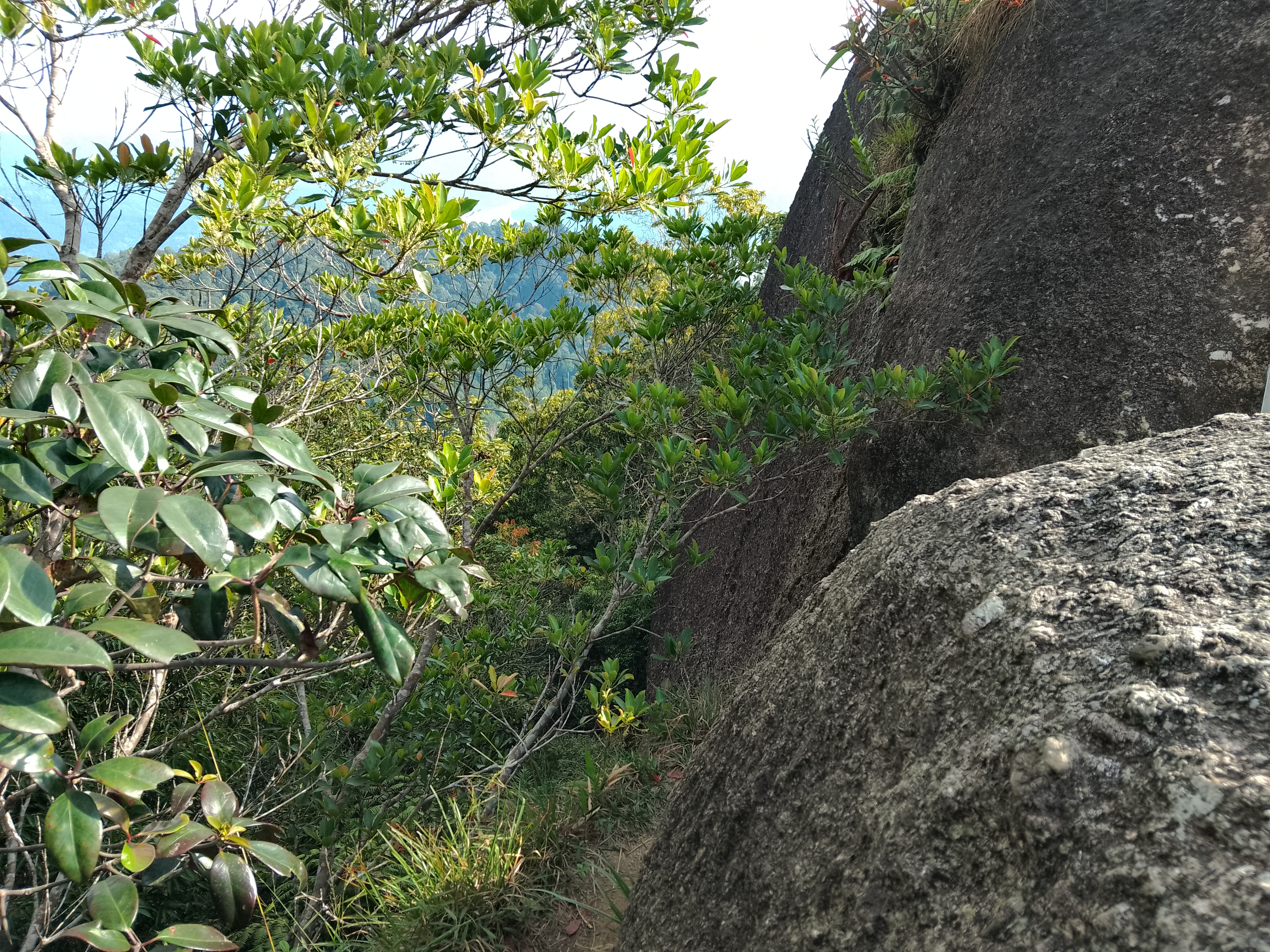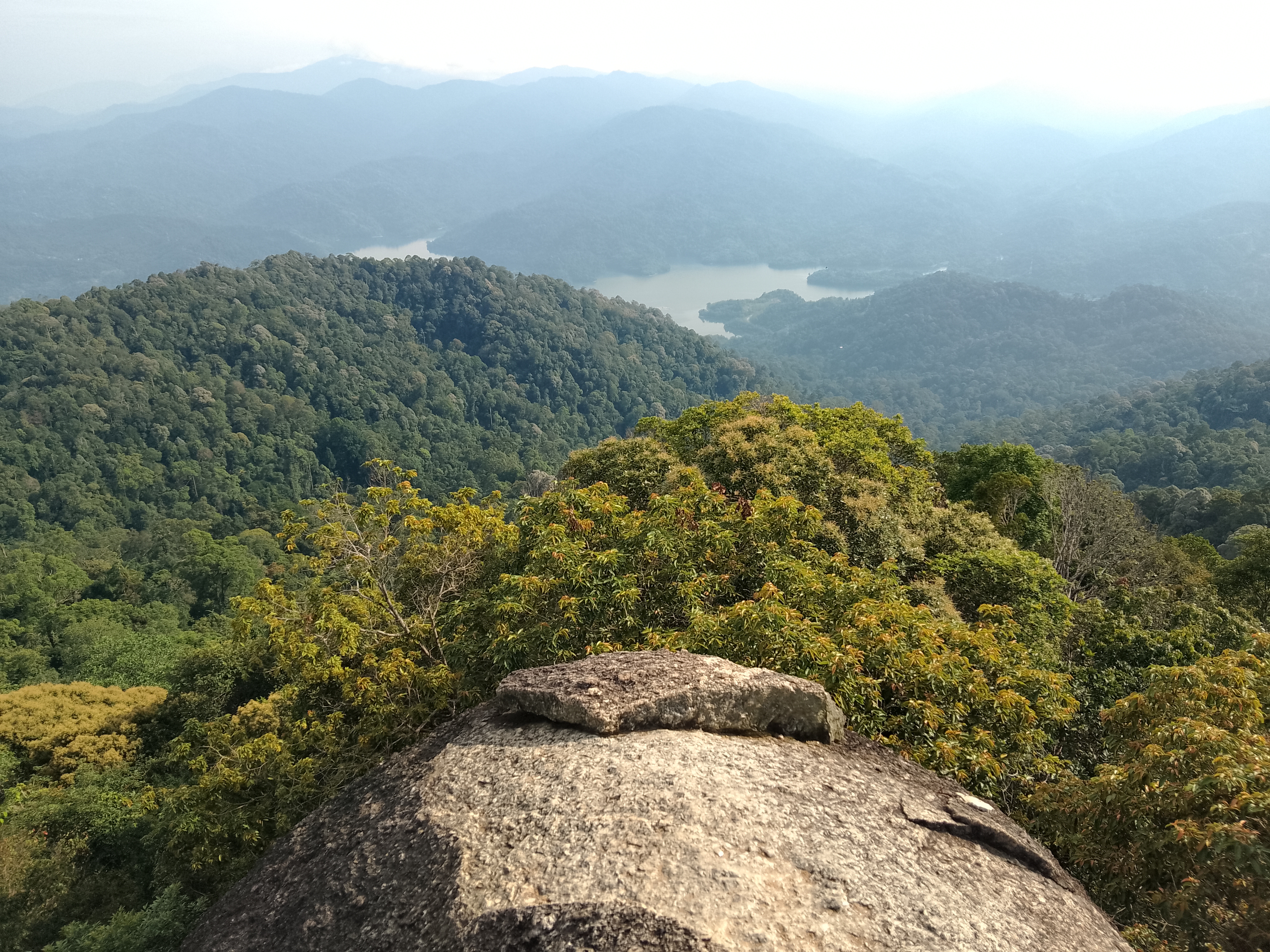 The Bukit Kutu summit boulders are just a few minutes beyond and above the bungalow chimney. Most online sources state an elevation of 1,053m but this seems to refer to the ground at the base of the boulders where there is a cement block, possibly once used for map-making. Based on GPS readings the true elevation at the top of the rocks appears to be in the region of 1,070m. Take real care on the boulders, which are a cluster of smooth egg-like rocks with ladder sections tied with rope to them. From the top you should be able to see beyond the Selangor river reservoir below to the peaks of the Titiwangsa Range northwards near Bukit Fraser (Semangkok, Twin Peak, Pine Tree Peak, Gunung Gap, Gunung Ulu Semangkok) and eastwards towards Gunung Rajah.