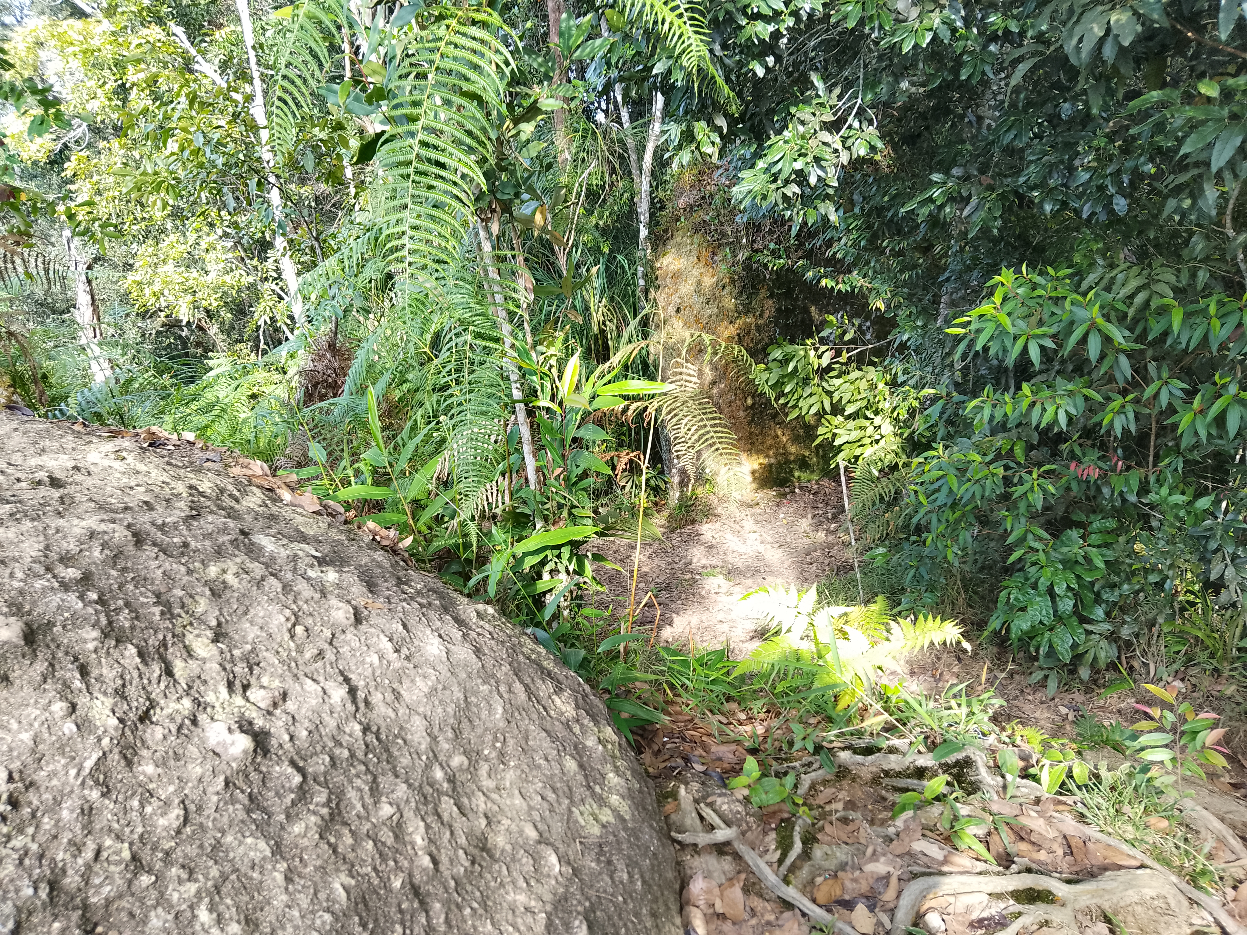 Next, you will find yourself near some rocks and another stream (621m). After this is the spectacular Batu Tedung (770m)which means ‘cobra rock’ in English, not because of there being lots of cobras in the area but because the huge boulder resembles the head of a cobra from certain angles. It is a genuinely enormous boulder and a wonderful point of interest on the trail. Once round the side of the rock, there is actually a minor junction on the left to a little viewpoint (813m with the viewpoint itself just a couple of minutes beyond at 818m).