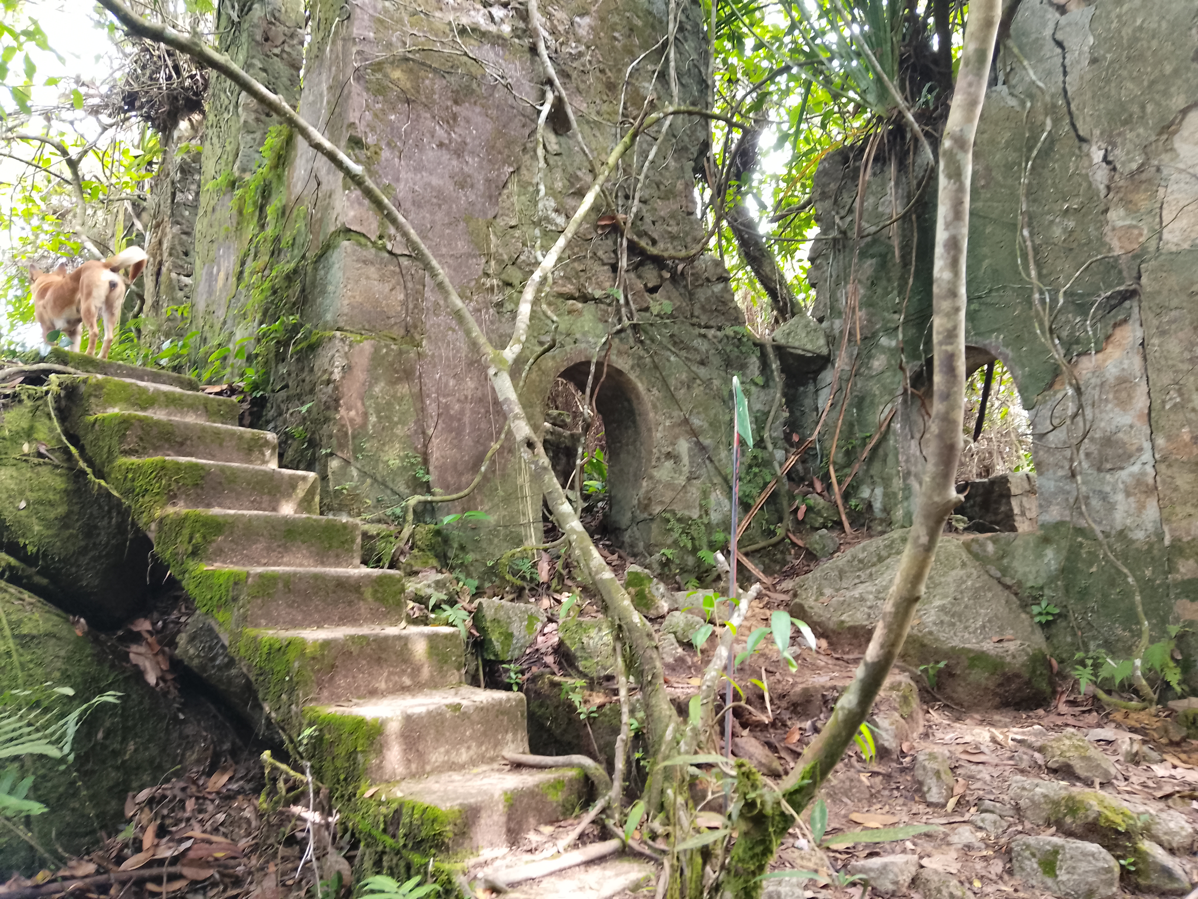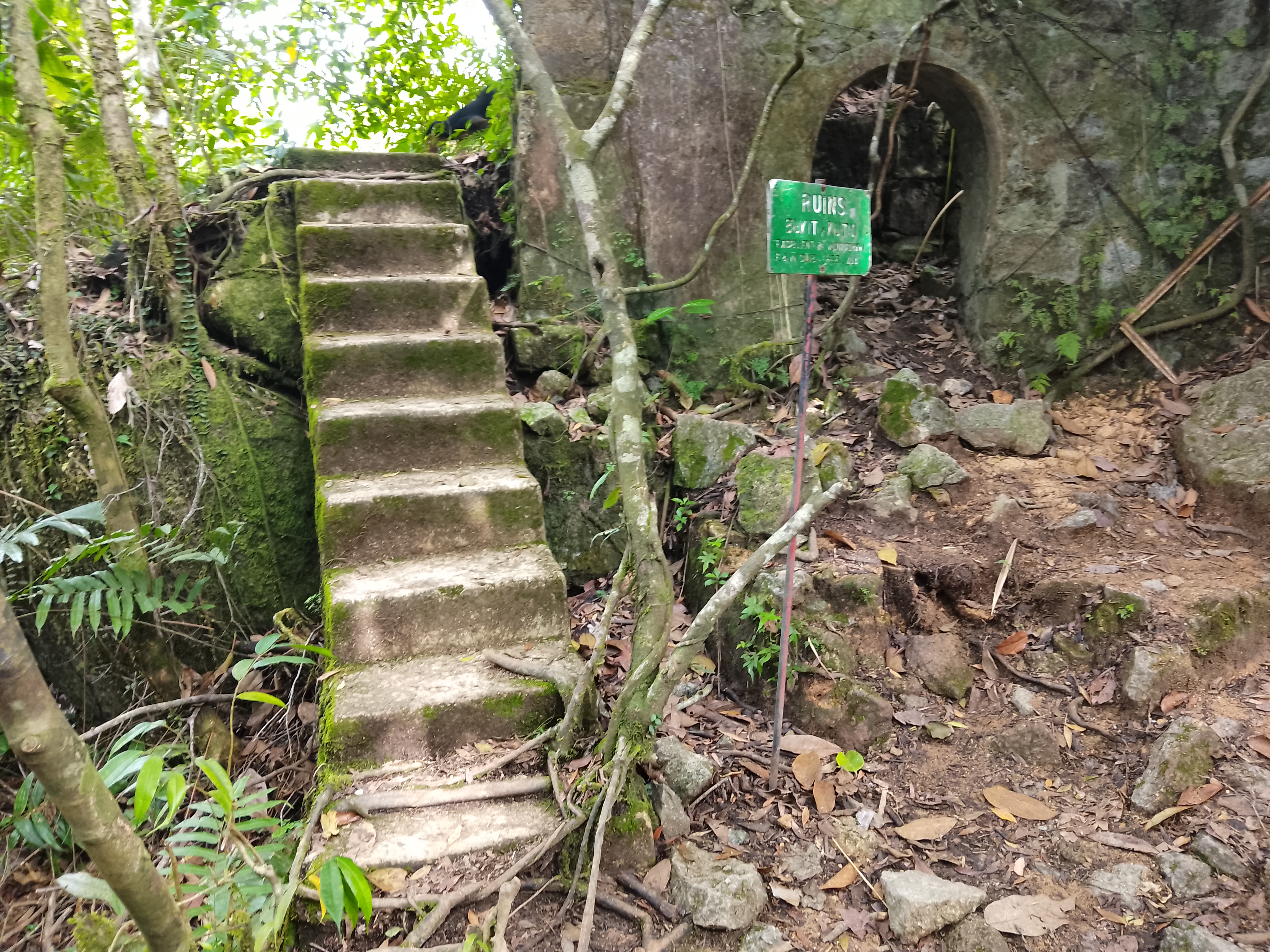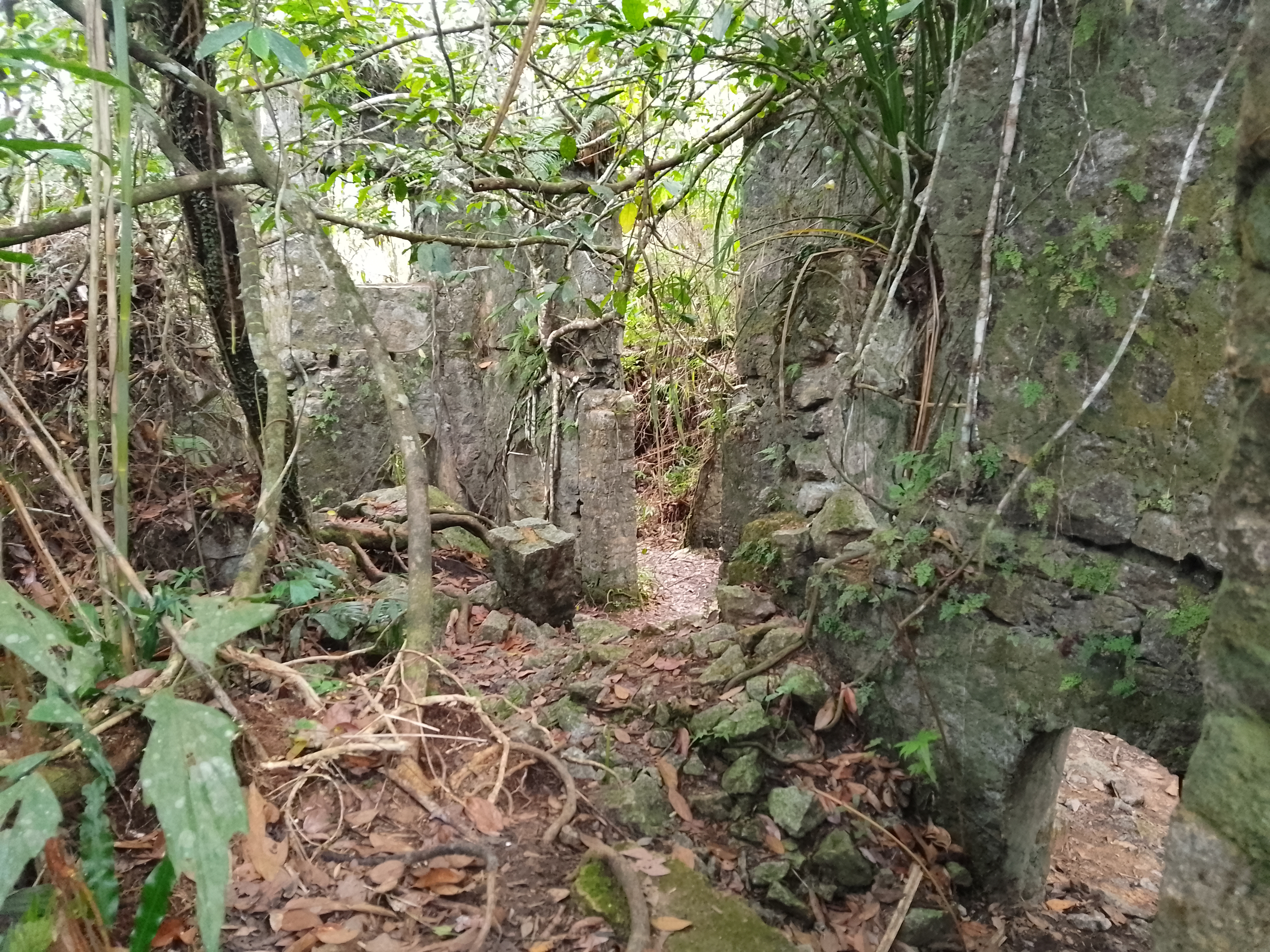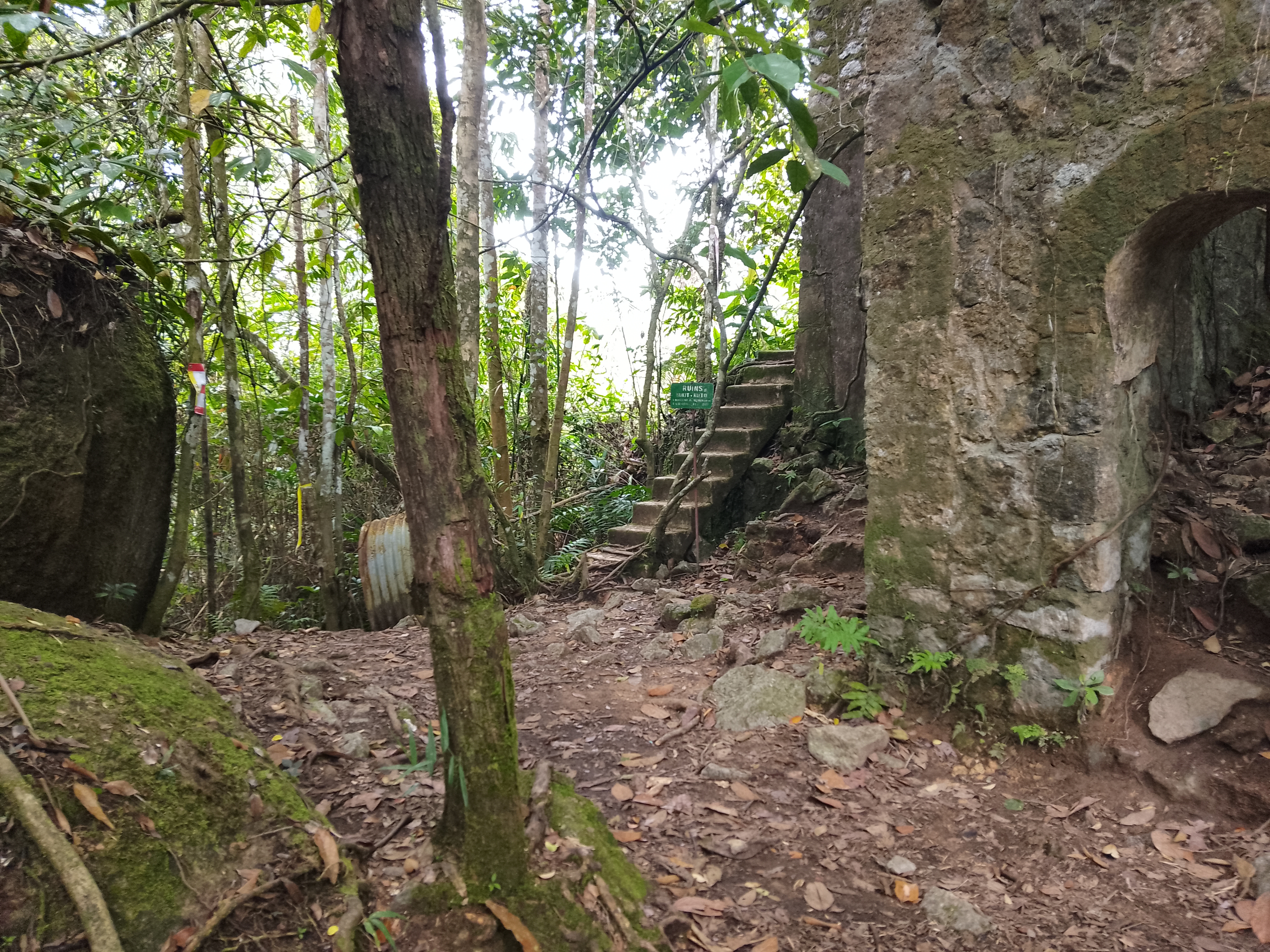 About 300 metres beyond the summit, or less than five are the ruins (also 1,044m) of a taller structure than a bungalow, also with well-preserved steps. These ruins are also well worth visiting though the original use is not clear.