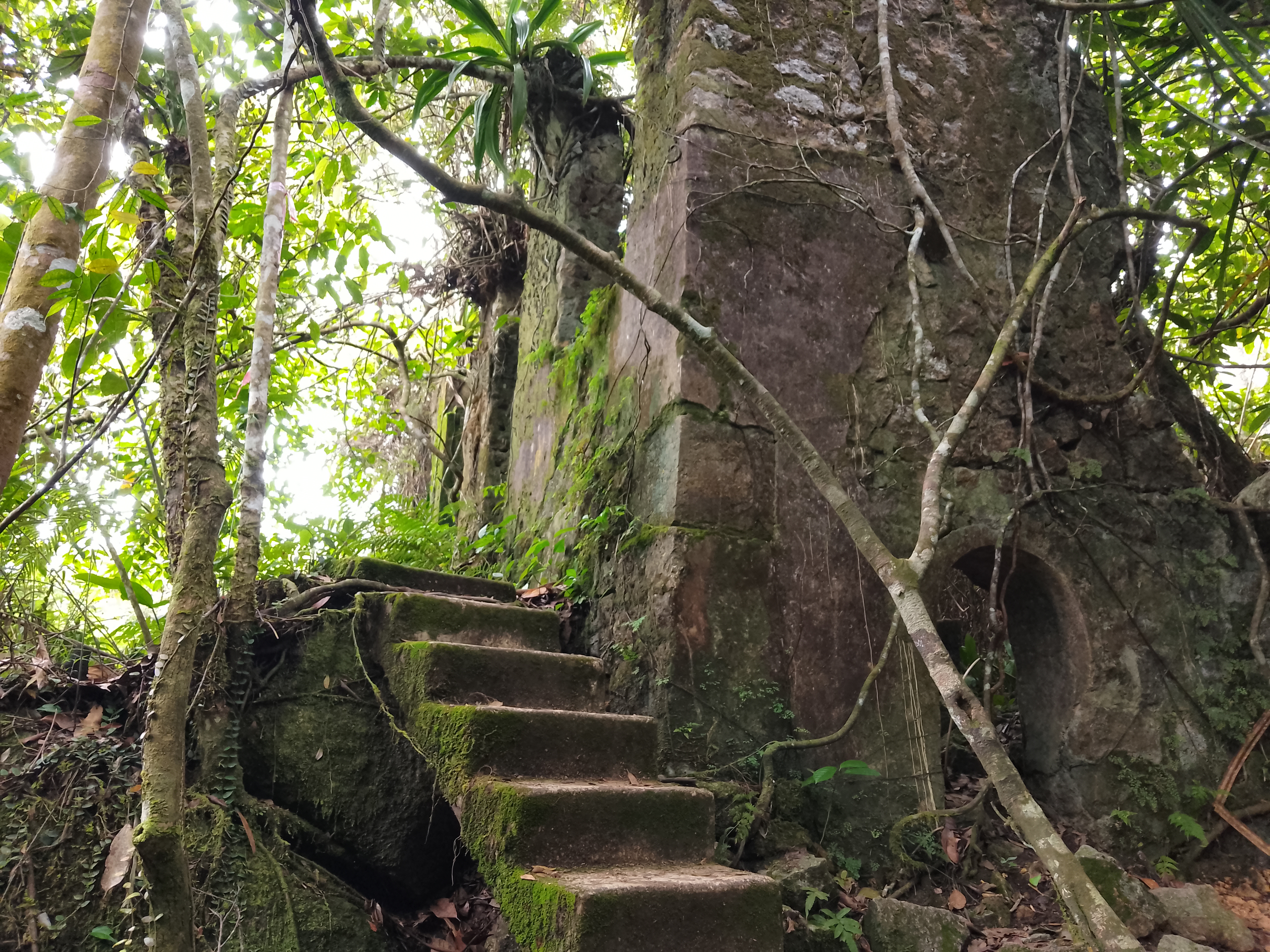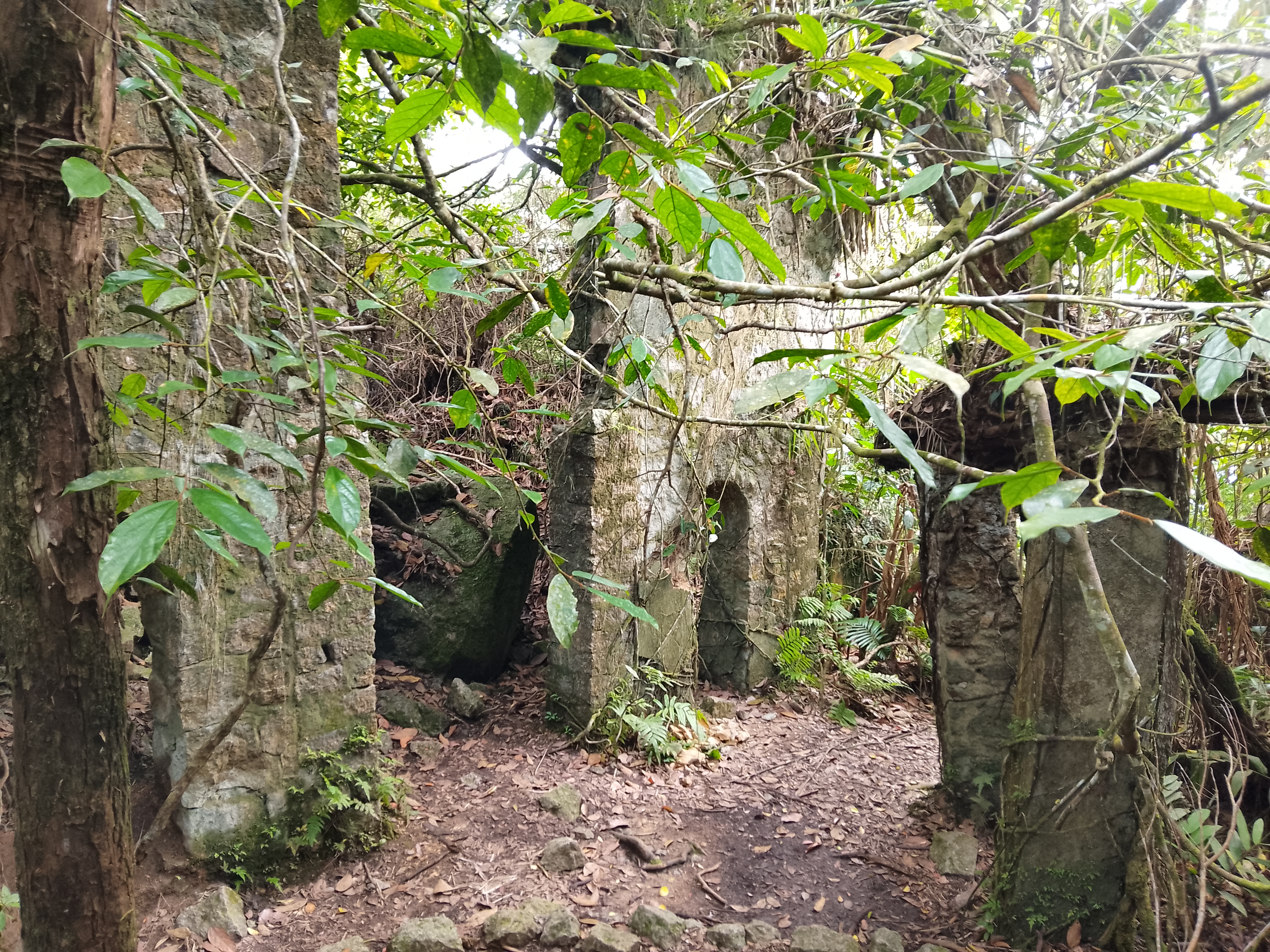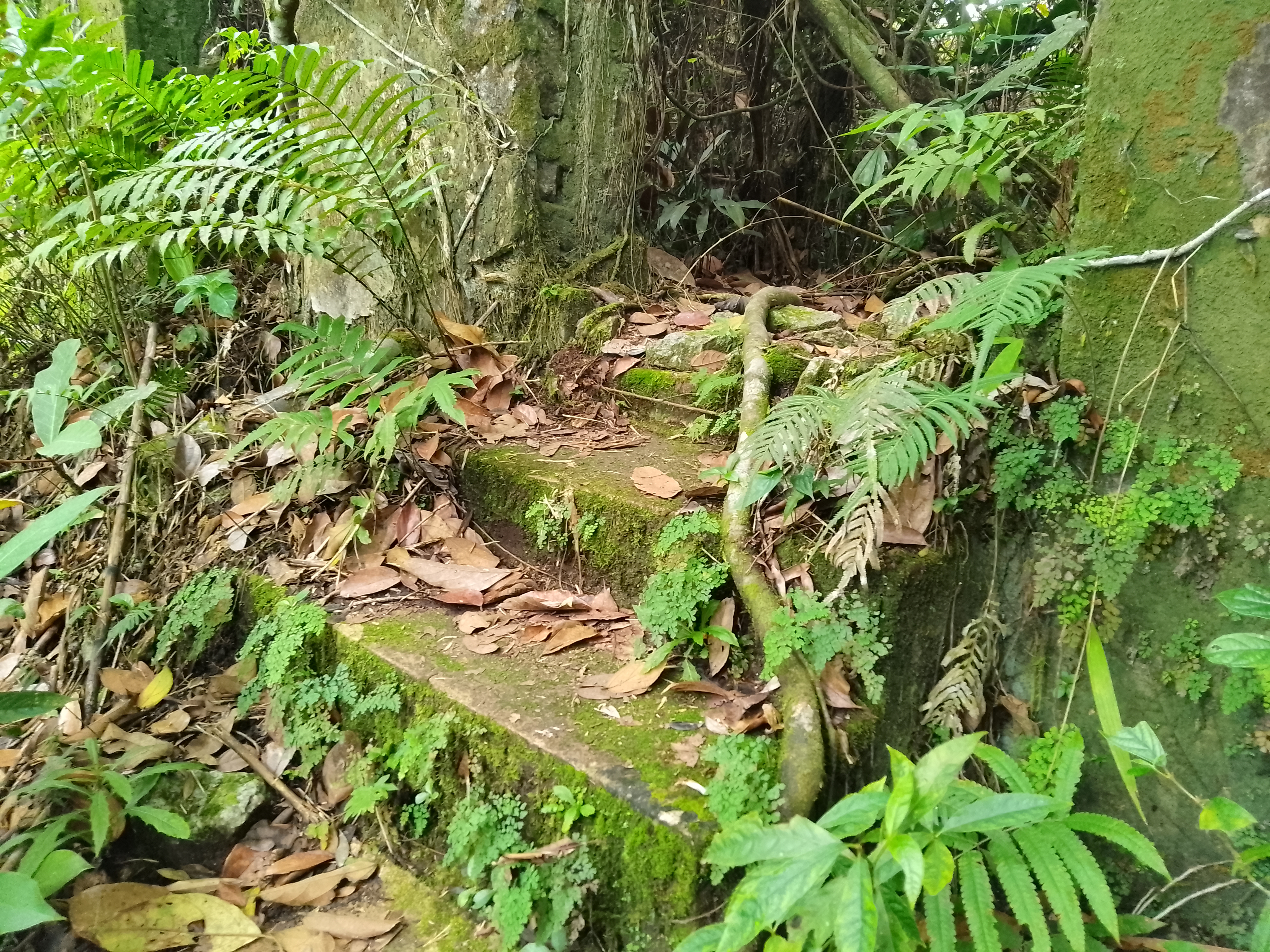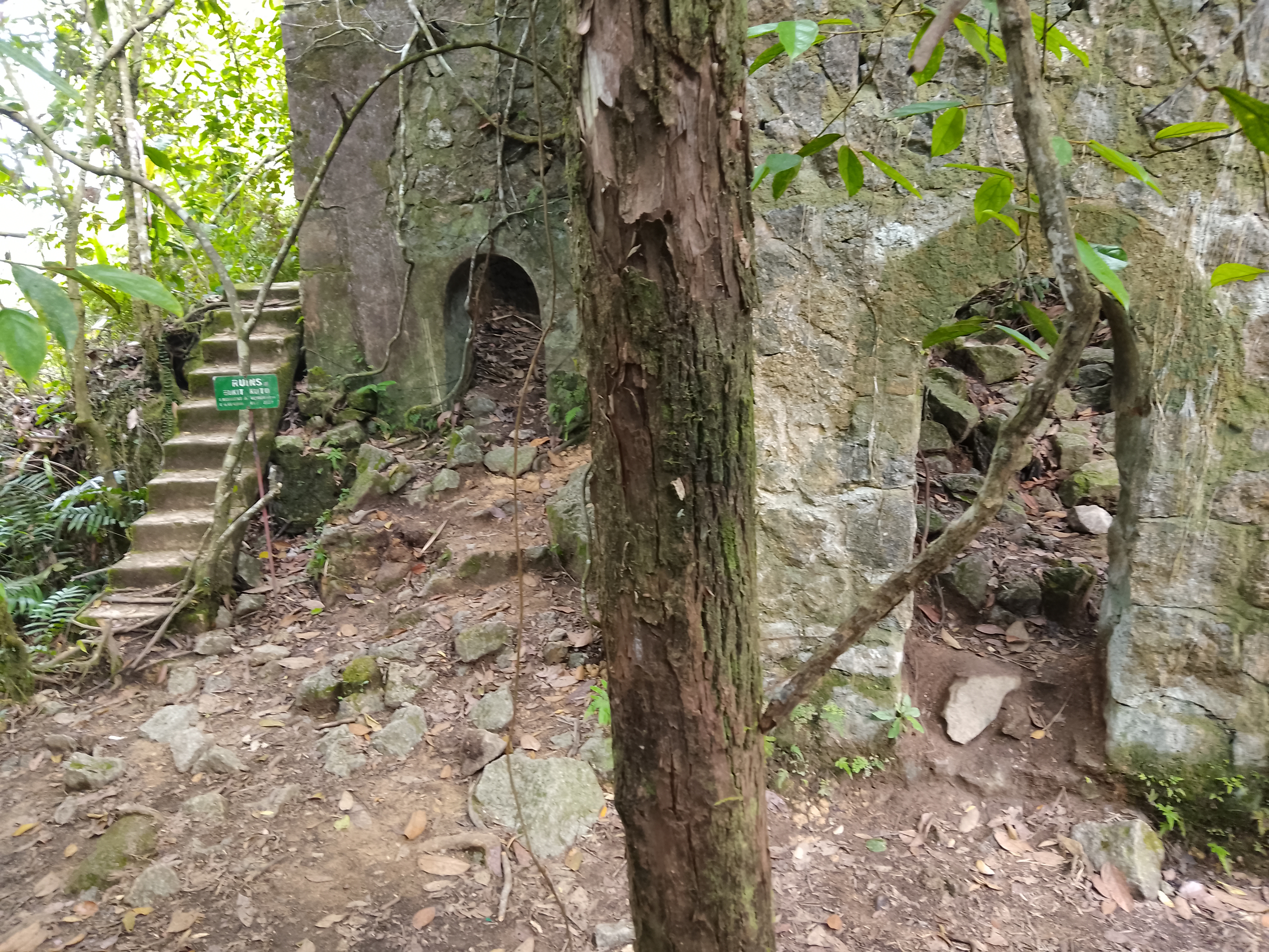 About 300 metres beyond the summit, or less than five are the ruins (also 1,044m) of a taller structure than a bungalow, also with well-preserved steps. These ruins are also well worth visiting though the original use is not clear.
