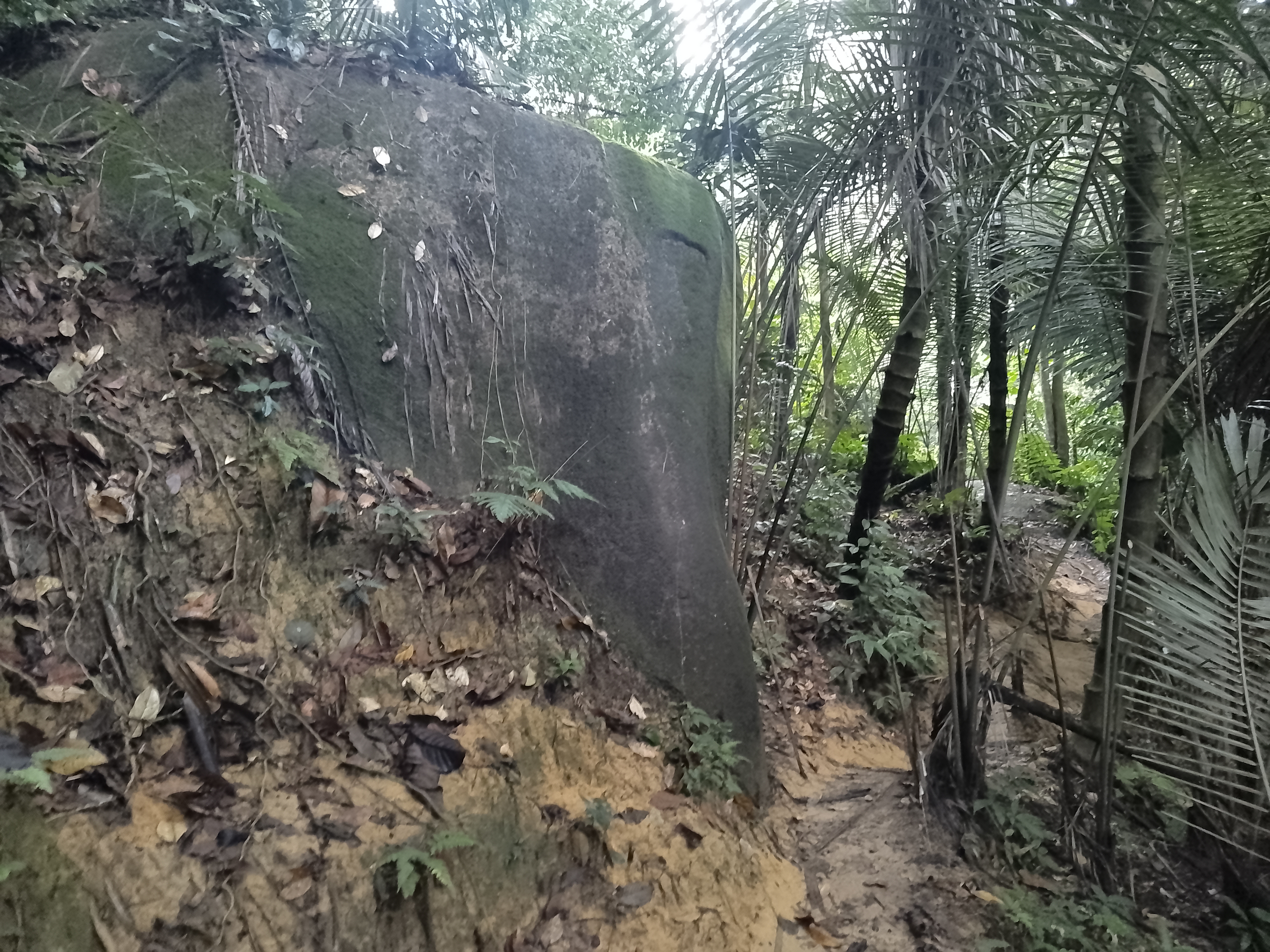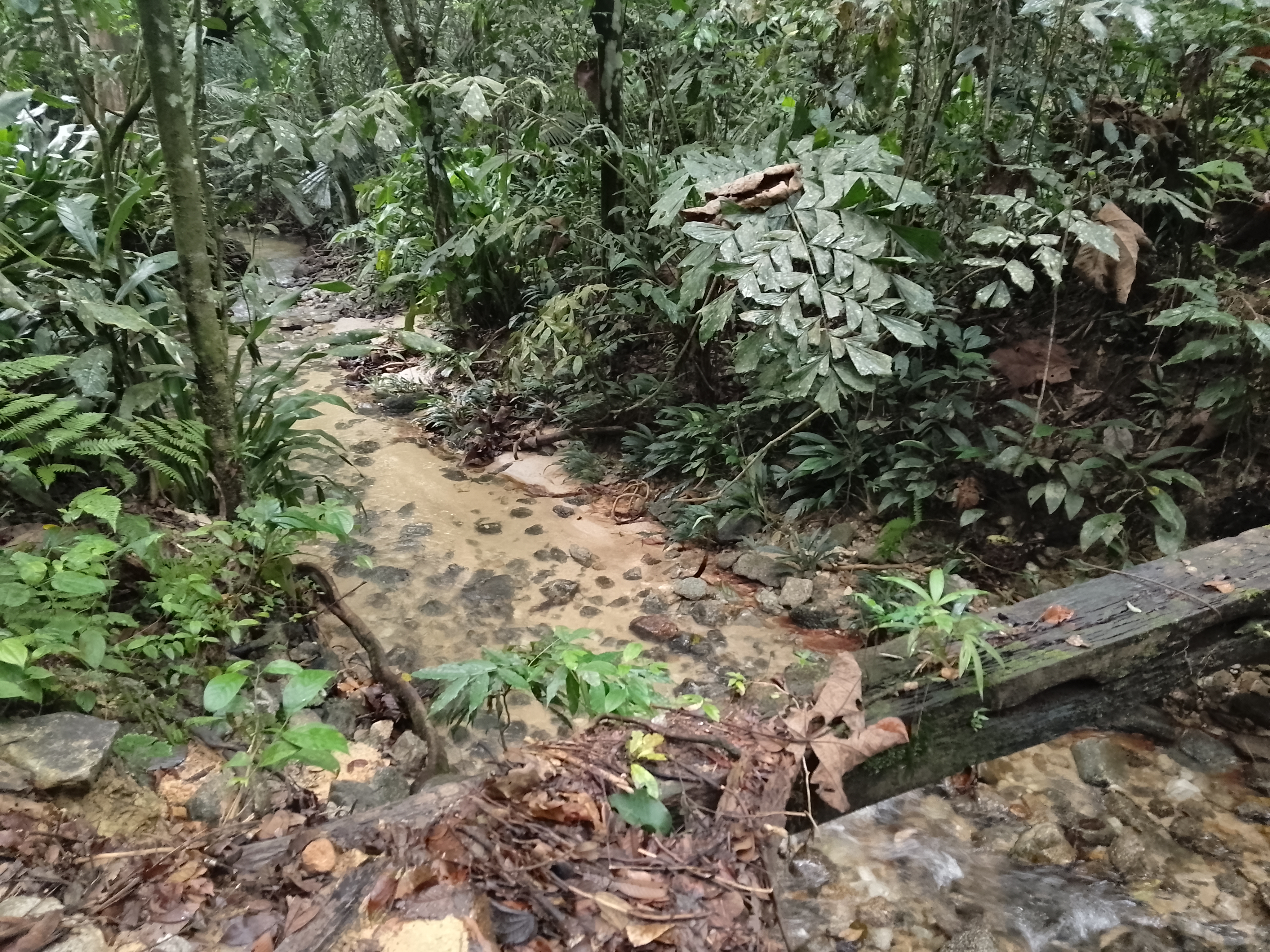 However, the best route, at least if you are intent of visiting the true peak and seeing more of the mountain, involves a right turn (174m) onto a minor track which drops down, leads over a stream (114m) and meets up with the track (179m) from the Orang Asli village as it weaves its way up an interior valley with minor stream crossings (248m and 254m) and Orang Asli huts (292m) towards the col (331m) between the hill near the logging road viewpoints and the true summit. This interior valley trail is marked as Kolam Ikan (‘fish pond’) for those coming down this way.