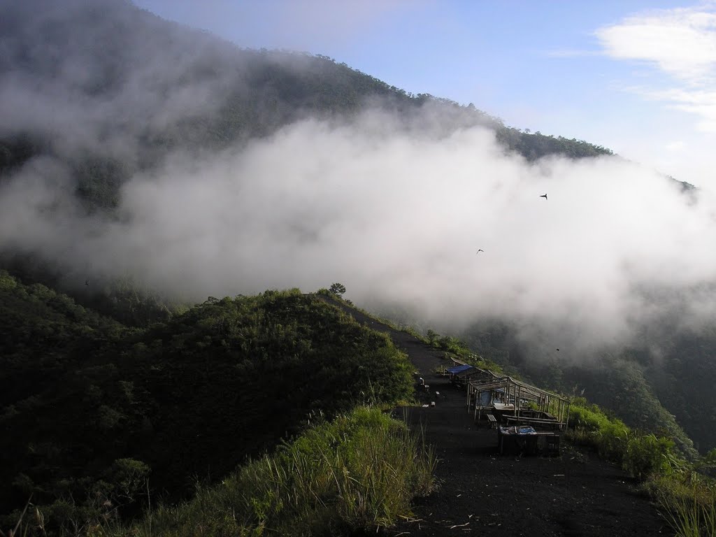 Just beyond the trail junction is Pos 4 which is Pasir Geber (1,191m), a rough translate of which is ‘Breezy Hill’ and it has a wooden seat on which to sit and enough space for 3 tents or so. Listen and look out for lutung – there are many in the forests here. In this area you will also see the earth is largely comprised of coarse volcanic black sand, a sure sign of previous mega-eruptions!