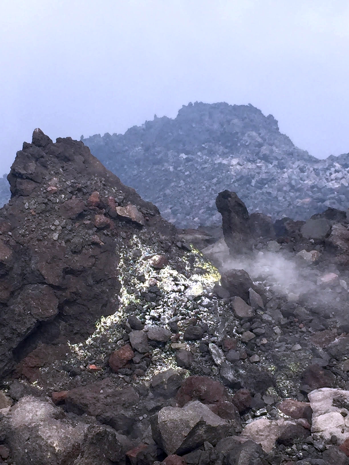 The more accessible south peak is apparently higher than the north peak, but it is difficult to be 100% sure given the usual gas and steam at the top making views obscured.
