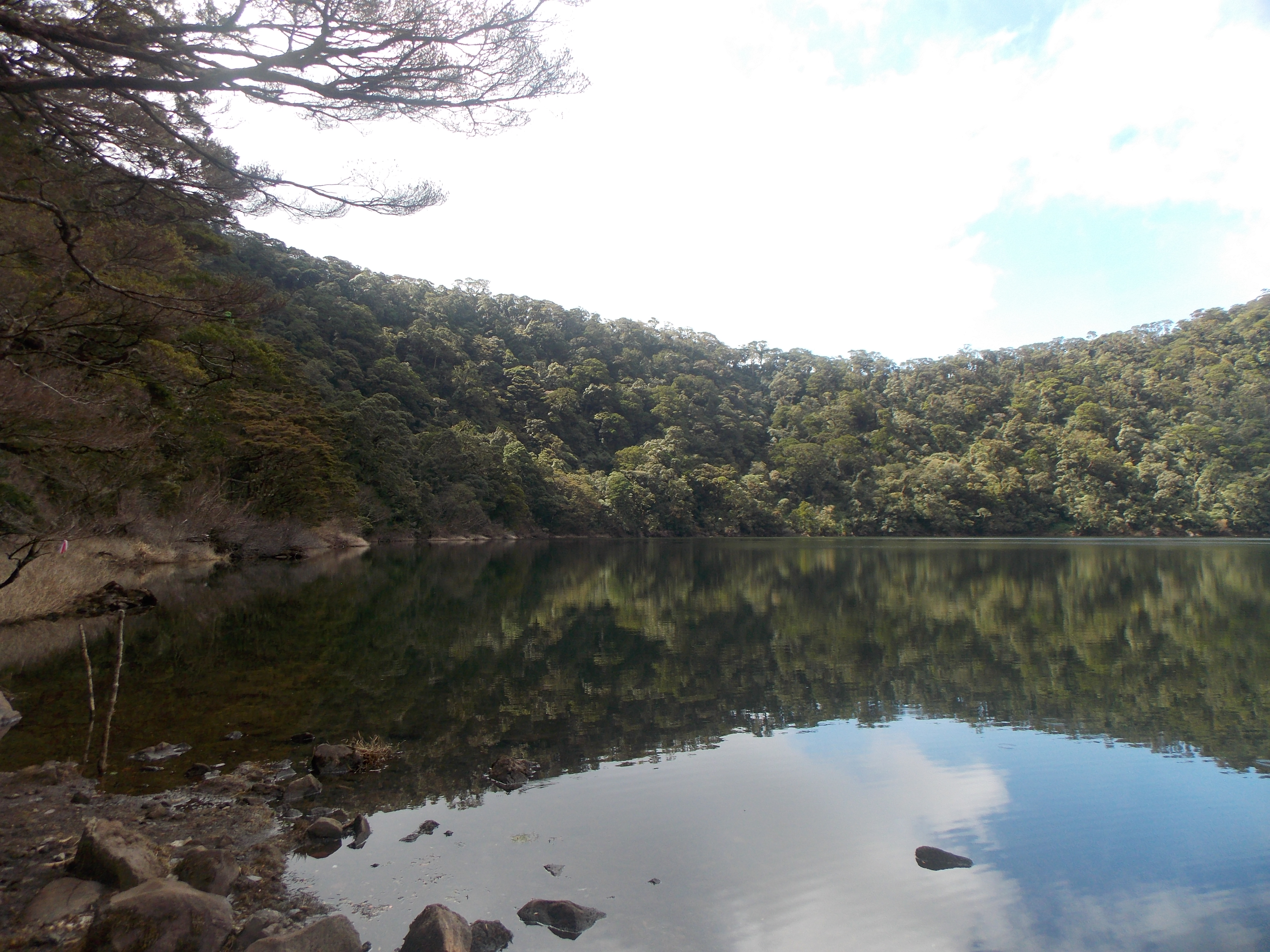 The next morning we set off for the true summit… only 1.44km away but took 2 hours slogging in light rain under and over logs, through deep mud and so on. Lots of pitcher plants but the very few open sections offered us no panoramas but of grey cloud. The summit itself (seemingly known as Puncak Top) has tons of signs and a few broken bits of cement pillar scattered around. No views, but to have reached this point is a decent achievement. 2,942m according to both GPS devices we had with us. Another 2 hours back to Puncak 1 where we had lunch. Then the sun began to shine a little on the lake side so we went down there to fill our water bottles. The plan had been to try to reach the excellently-named Danau Mabuk (‘drunk lake’) that day too but it is apparently a 4 hour return journey from Puncak 1 through terrain a bit like that on the way to the summit.