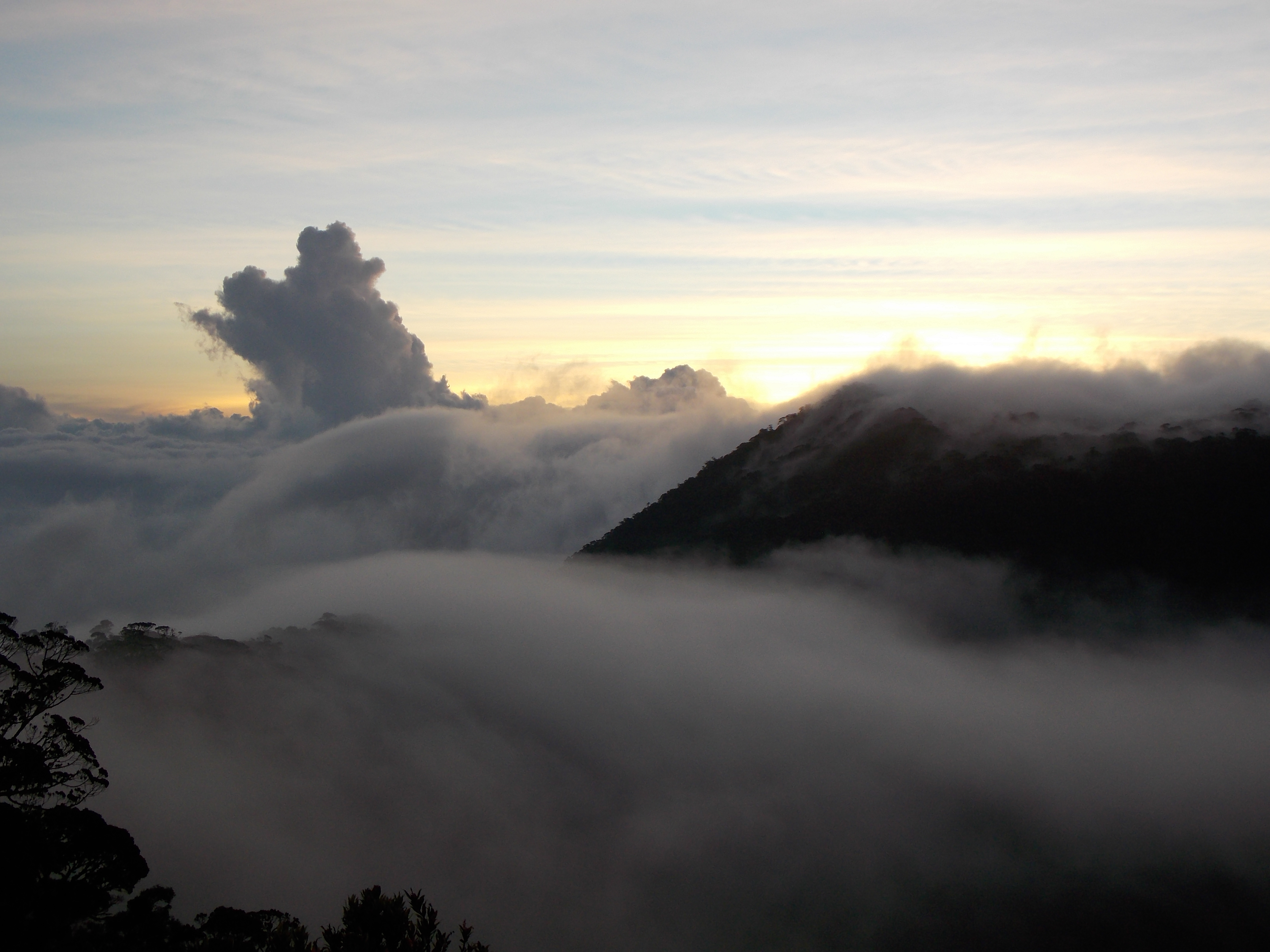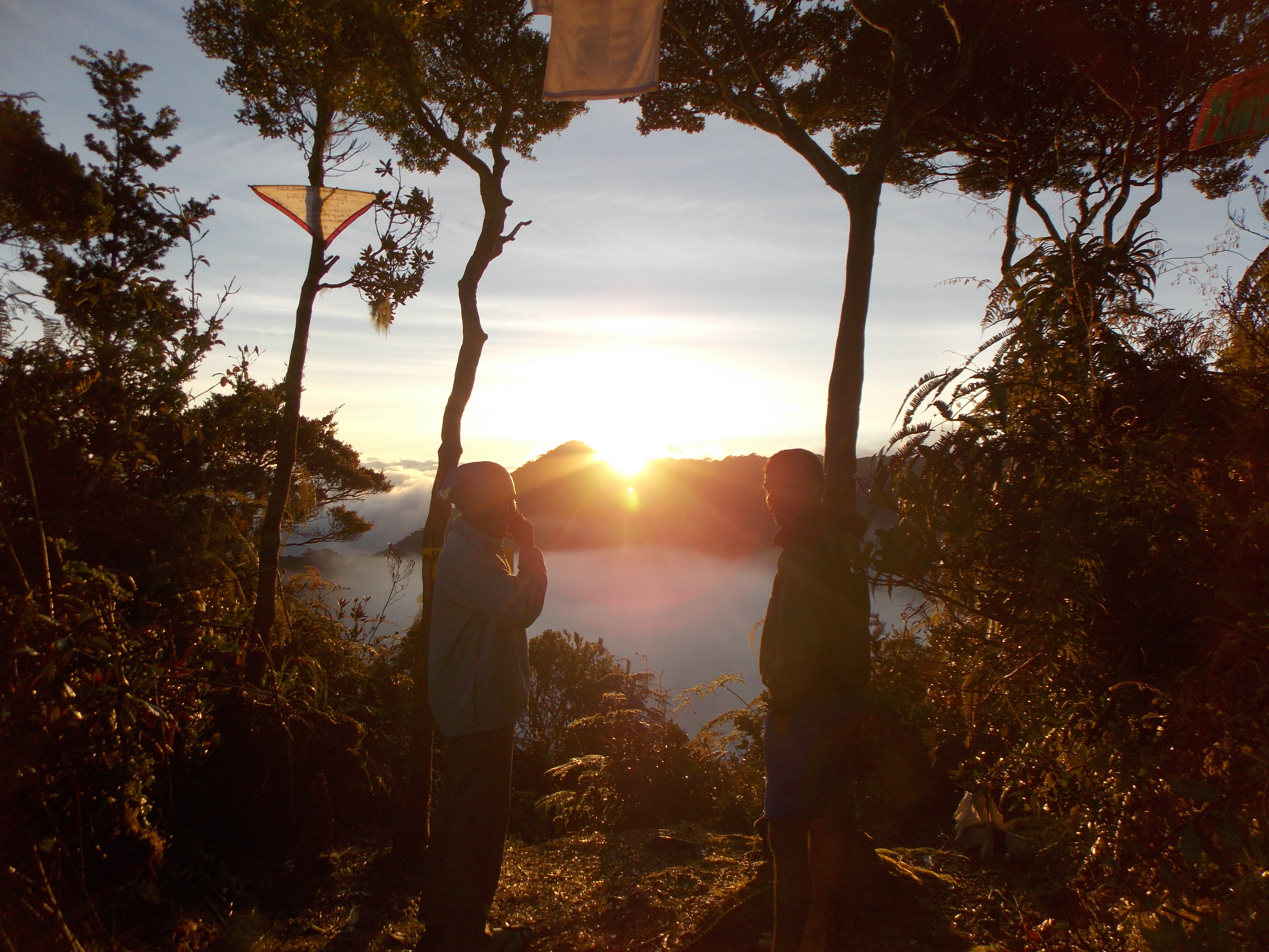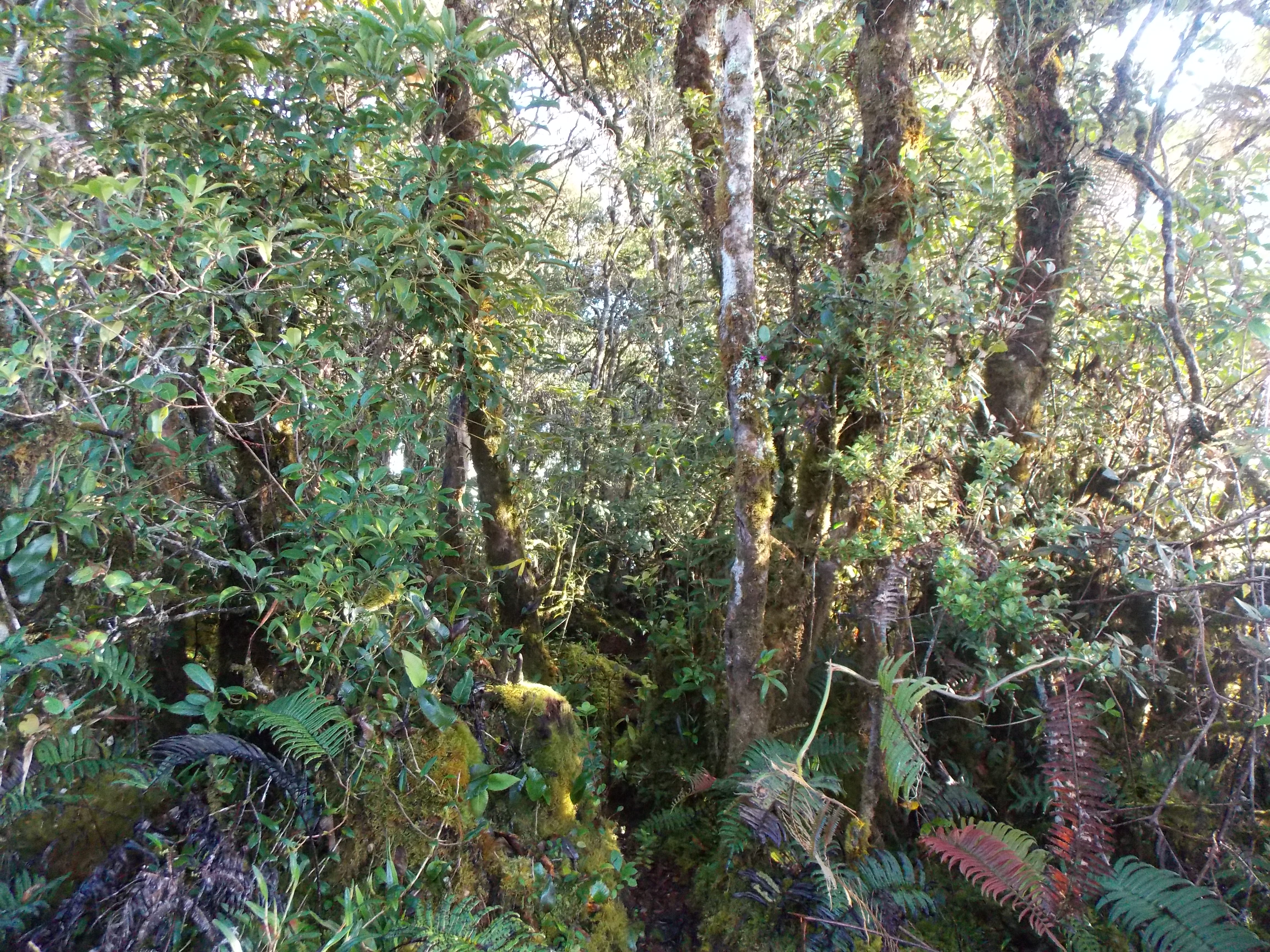 Despite only being 1.4km in a straight line, from Puncak 1 to the true peak (seemingly known as ‘Puncak Top’) is about 2 hours of tough trekking through moss forest, clambering over logs and squelching through mud! Look out for pitcher plants along the summit ridge and for occasional good views to the left of the trail. There are lots of birds on this mountain and you have a good chance of seeing eagles. There are no panoramic views at the true peak but it is well sign posted and there are numerous signs left on a tree there by local hiking groups. There is enough space for 2 or 3 tents at the true summit but because of the lack of views and difficult terrain between Puncak 1 and the true peak it is not recommended as a place to camp. Remember it is at least 4 hours from Puncak 1 to the true peak and back again.