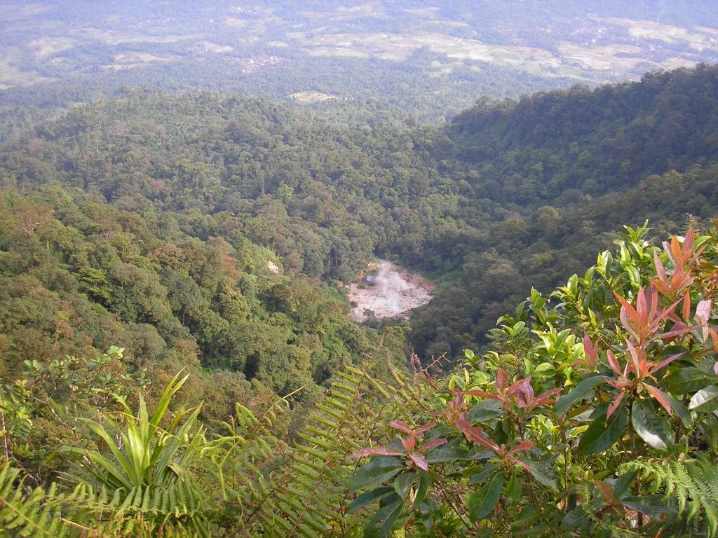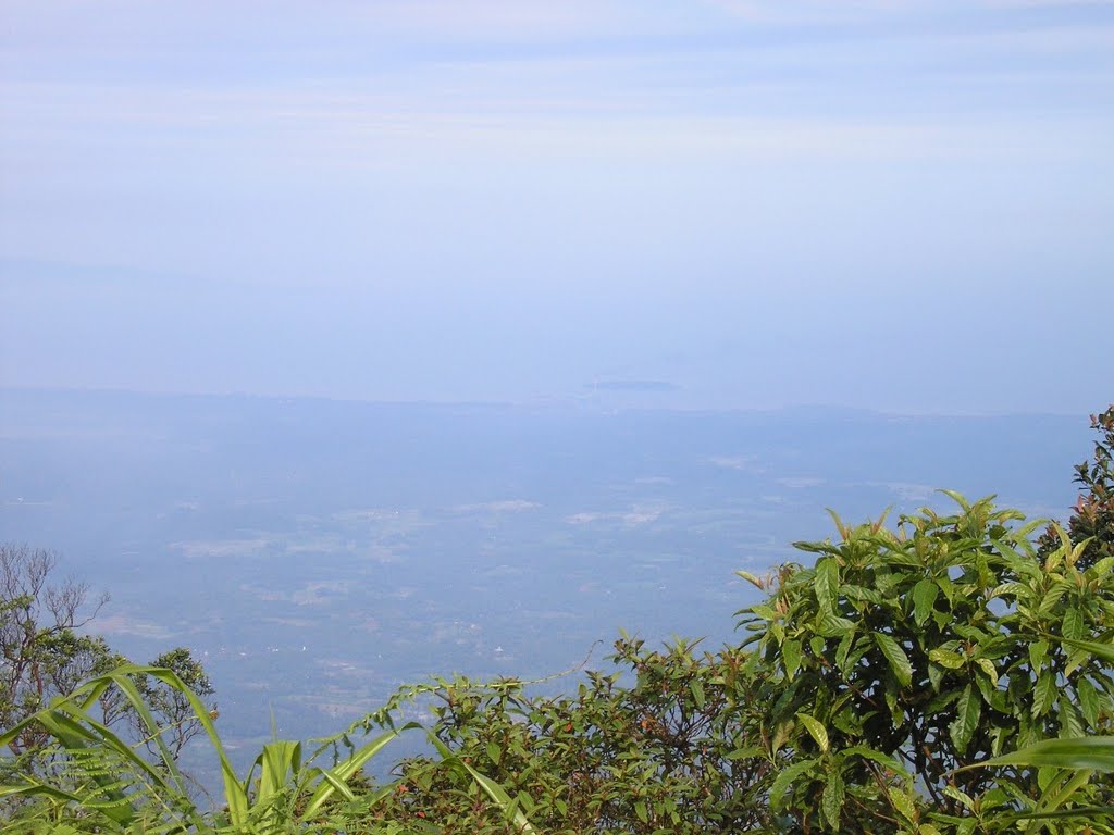 Straight above the crater area is the summit itself, about 300m up at the top of the vegetated crater wall. You may be able to see the transmitter on top. The trail leads up to the right of the crater and there are some very steep drops to the west so take extra care here. Occasional stone markers and the inevitable litter mark the way. There are also monkeys in this area which you might see. After climbing steeply over tree roots the vegetation becomes less dense and you see over the valley to the lesser peak of Aseupan and Java’s west coastline. As you near the top, there is a great spot looking directly west to Labuan and the Sunda Straits from the south-western edge of the narrow summit plateau. In good visibility the Krakatau islands lie directly beyond the power station chimney at Labuan.
