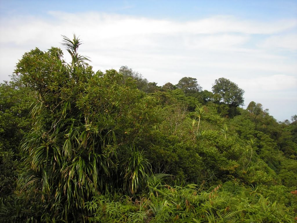 However, the true summit is further west and is accessed from the south-west at Desa Sikulan (280m). This peak is clearly seen as a shapely triangle from the villages and main road below and is 1,174m above sea level. The shape of the peak gives the mountain its name. The true summit can be reached via two different ridges, but the more direct one leads to an incredibly overgrown and dangerously steep section just below the summit. Best take the slightly more eastern one that is clear for the most part. A guide will probably be needed as there are numerous junctions on the lower slopes of the mountain. Ask in the village for Bang Handa.