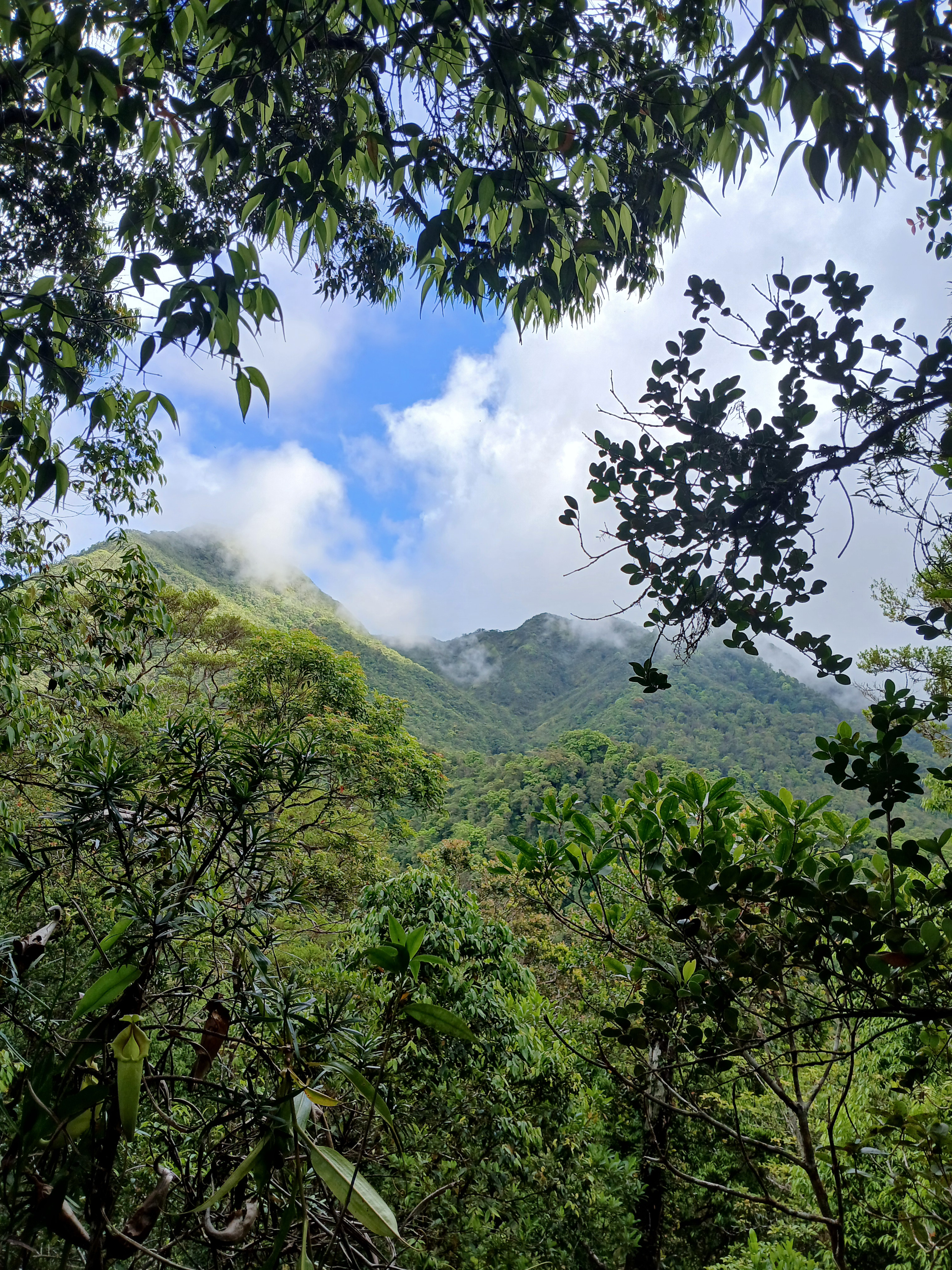 The hiking route starts in the north near to the coast at a farmer’s shelter in Hanenu near the village of Morela. This route is more often used for descents but is perfectly fine as an ascent route. The trail passes through a pala (nutmeg) plantation and quickly begins a steep uphill climb. As you gain elevation, stunning views open up along the narrow ridge, with sharp ridge lines visible on either side. You’ll also pass through a cengkeh (clove) plantation before entering denser forest.