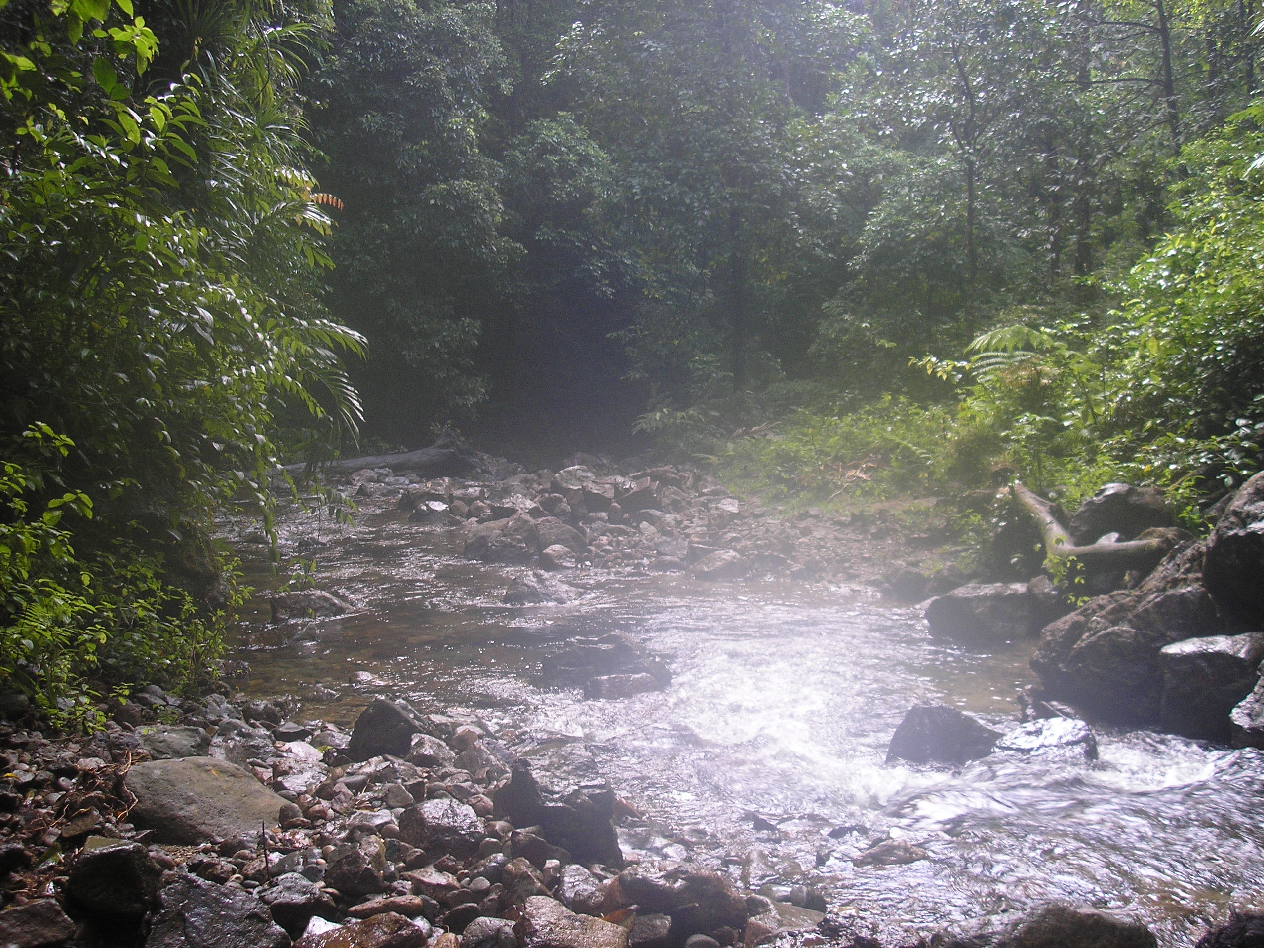 After heavy rain the river may be difficult to cross, but even during the dry season you may very well have to take off your shoes and socks and wade across so be prepared! The trail now ascends steeply and is muddy and covered is thick roots which can make things a bit difficult. However, once above 500 metres elevation the temperature gets a little lower and you start to sweat less! The sound of the river still reverberates long after leaving it and when you reach a sign at 689m the trail is very close to another smaller river. This is the final source of water on the hike.